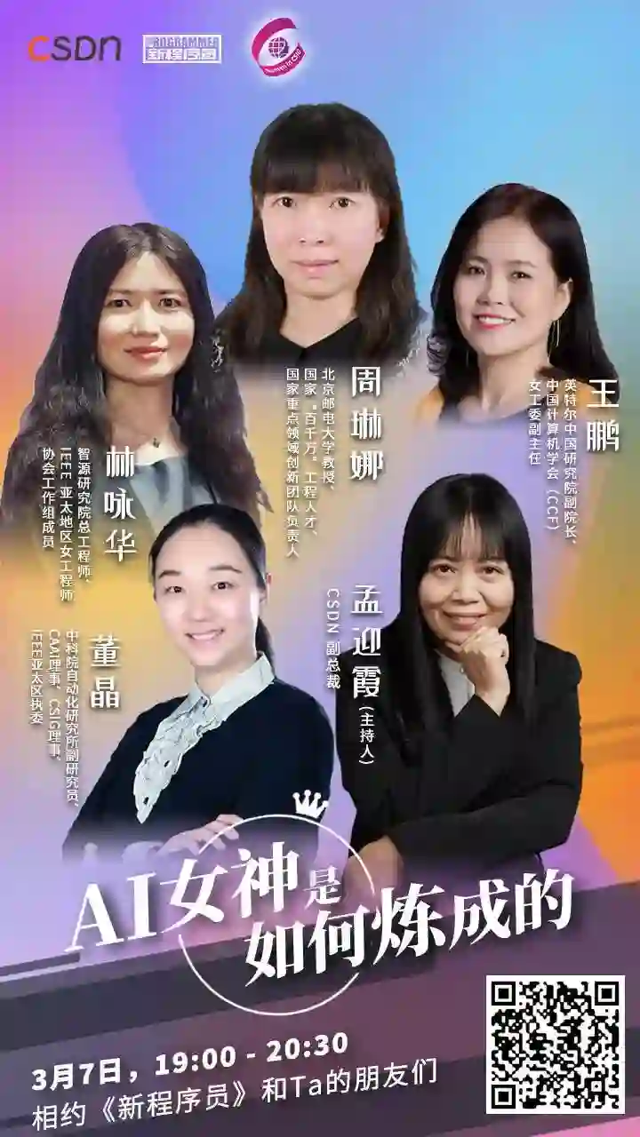 为此,恰逢三八女神节到来之际,CSDN 和 CSIG 女工委(中国图象图形学学会)将于今晚 19:00 联合主办「《新程序员》和她的朋友们」女神节特别活动,围绕「AI 女神是如何炼成的?」这一主题,特别邀请到了四位卓越的 AI 女神级嘉宾揭晓其成功背后的成长与挑战。