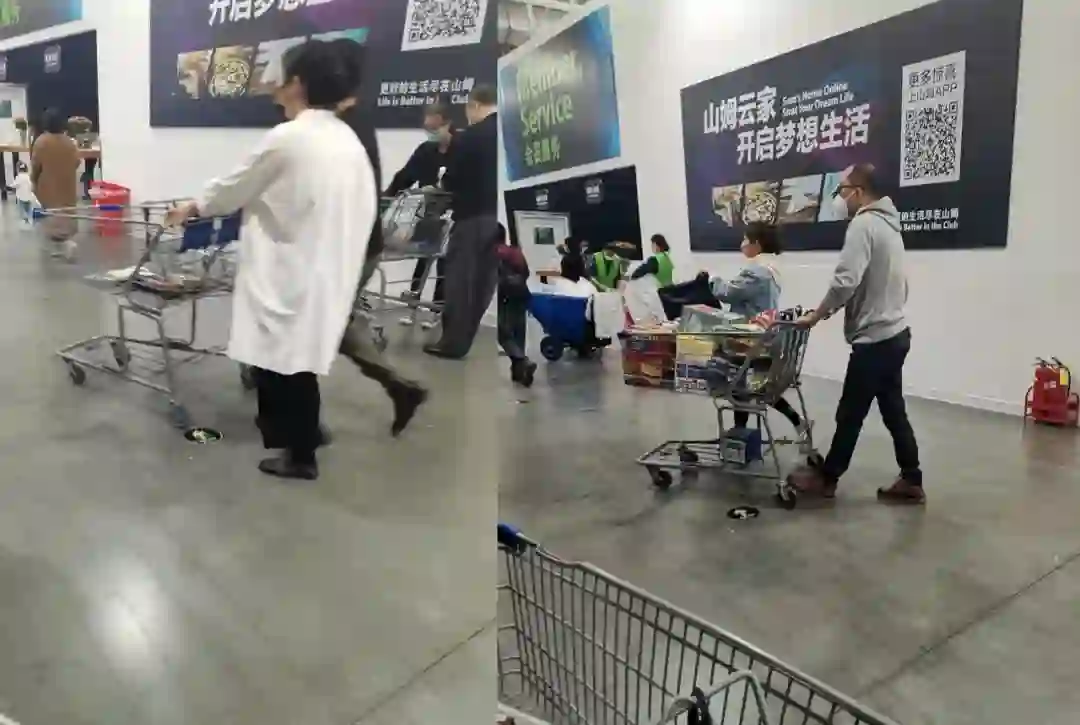 社交平台上,有人吐槽,“山姆店简直跟不要钱一样”,两排下楼电梯上全是戴着口罩推着车的人;还有人来得晚了,蛋糕都被买空,连普通的蝴蝶酥都差点没买到。在成都的山姆店,人多到需要管制,工作人员在停车场分批拦截购物车,等待一段时间再放进去。
