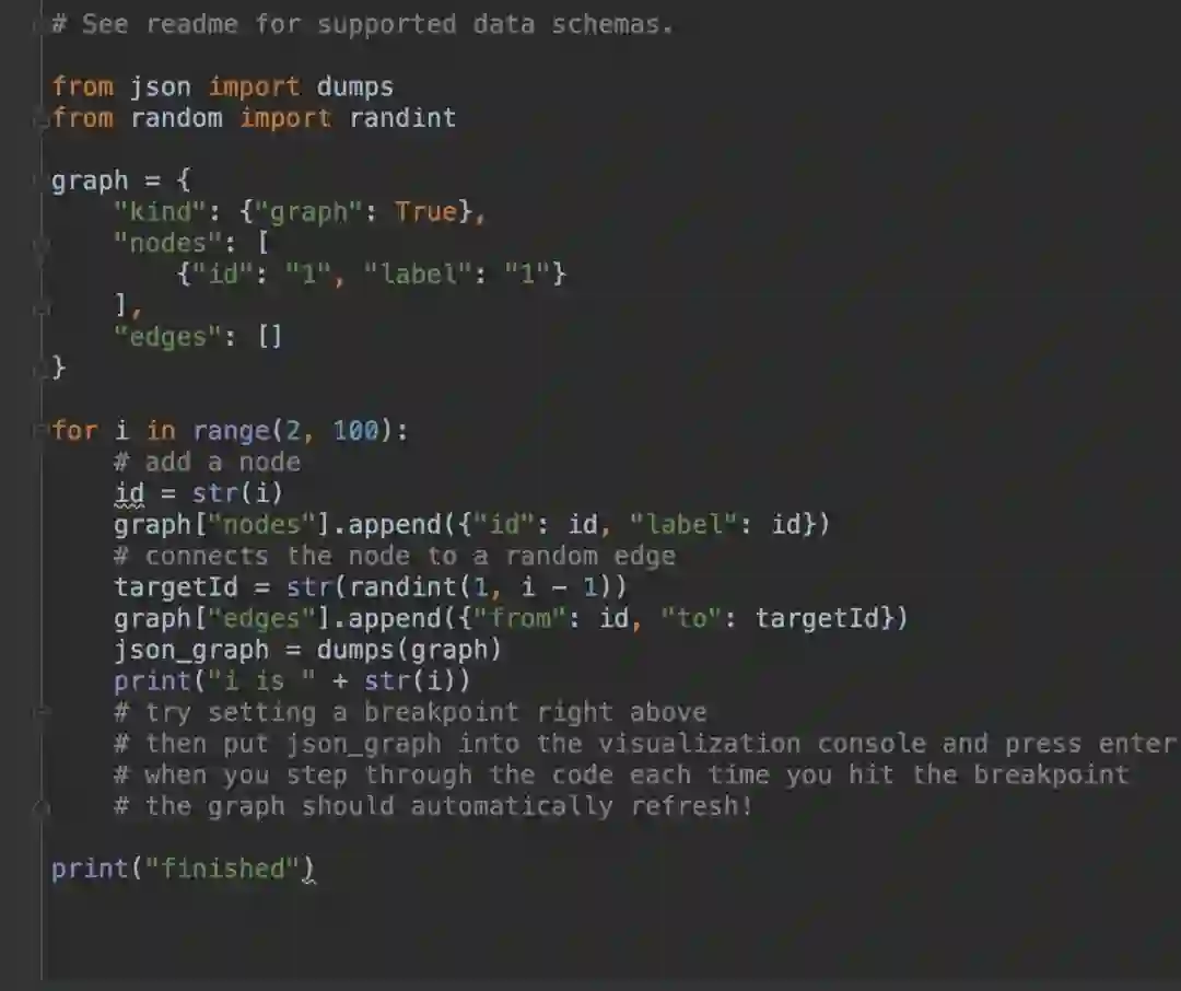 那么如果要手动调用 Debug Visualizer,开发者在 Demo 中新提交了一个 Python 示例。我们需要以 JSON 格式来表示数据,并完成自定义可视化,注意该 JSON 需要满足 Debug Visualizer 的格式定义。