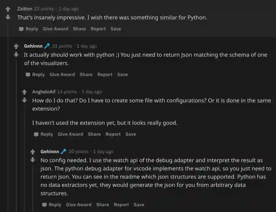 在 Reddit 社区上,也有很多开发者在讨论 Python 是不是能用,有没有更便捷的方式自动可视化 DeBug,而不是在 DeBug 前还需要手动先配置一番。