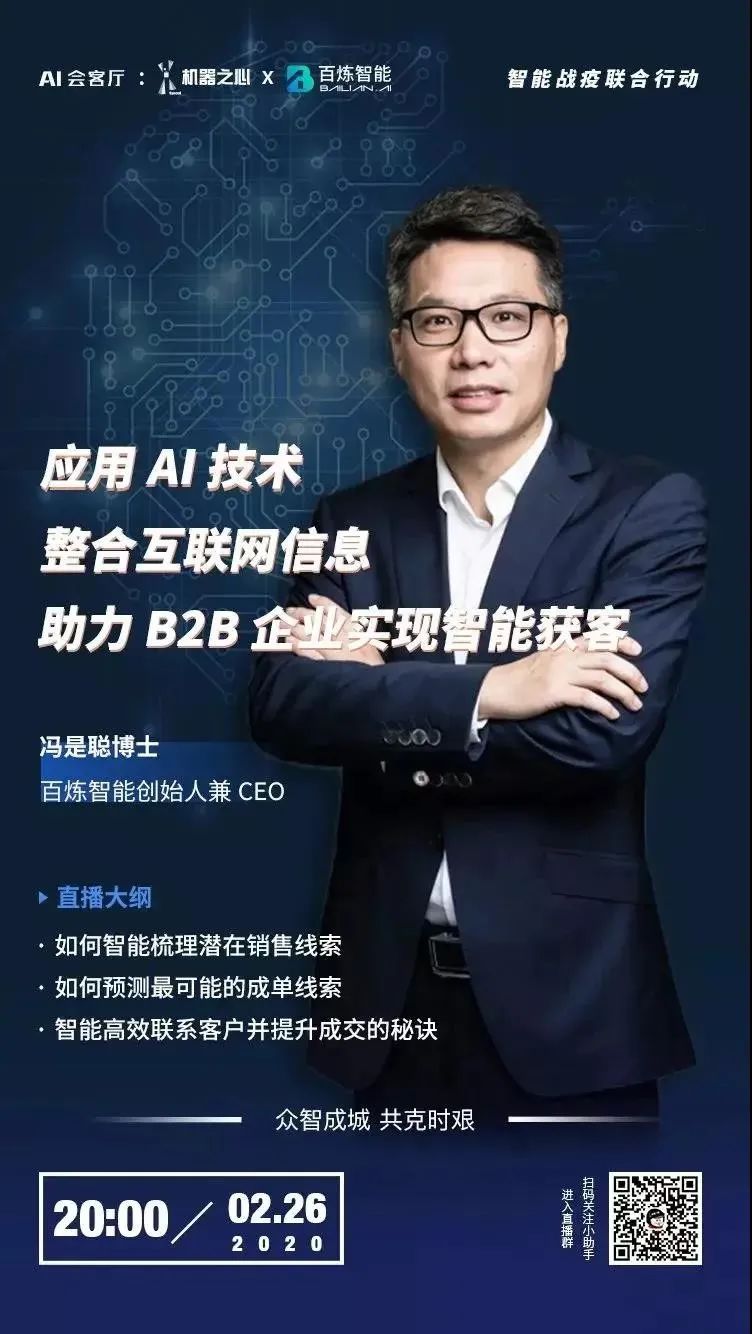 疫情突如其来,公司业务受阻,如何改变营销策略实现线上突围?智能战疫「AI+营销自动化」在线分享第一期,机器之心邀请到了百炼智能创始人兼 CEO 冯是聪博士,给大家支招如何应用 AI 技术,助力 B2B 企业实现「非接触」式线下智能获客。2月26日(周三)20:00,识别二维码添加机器之心小助手,立即加入直播群。