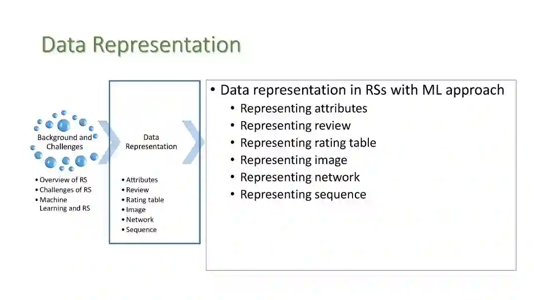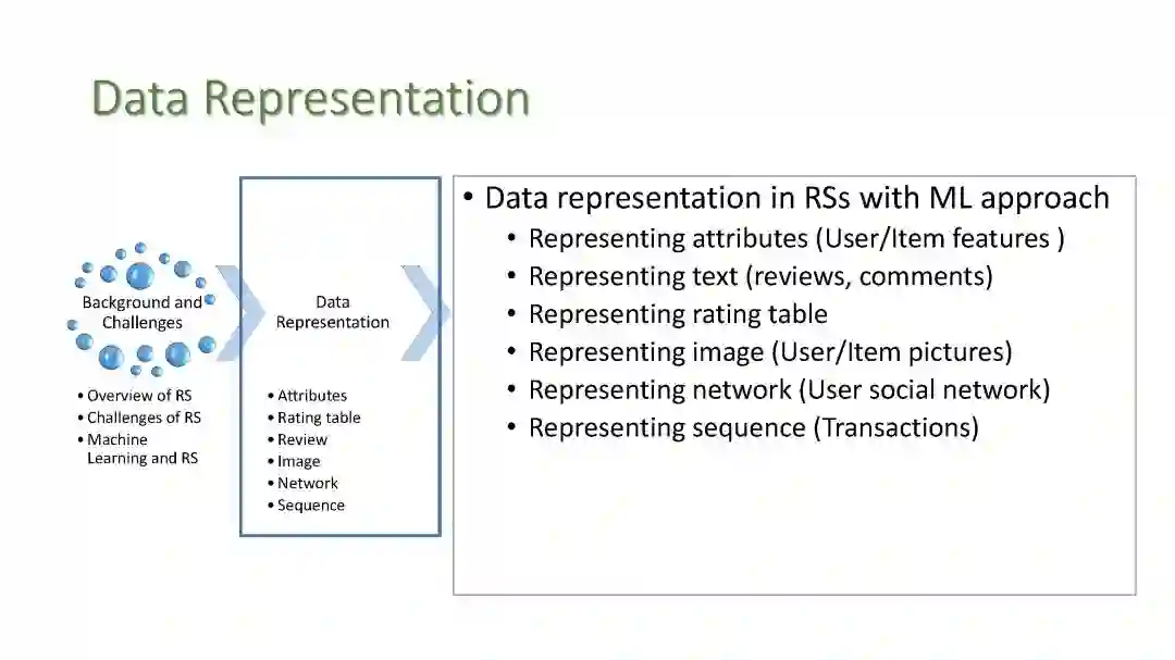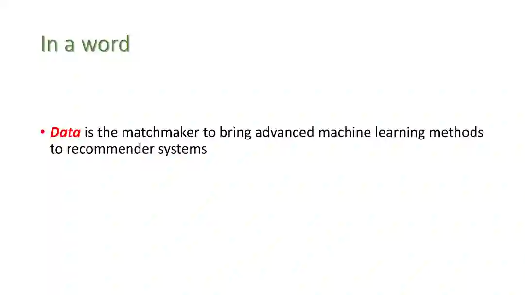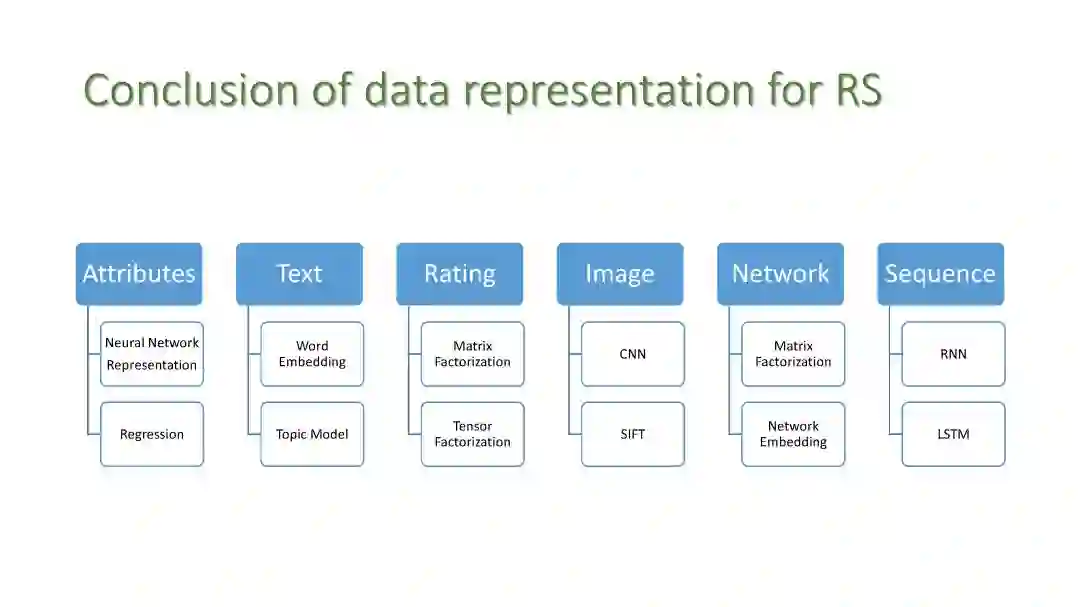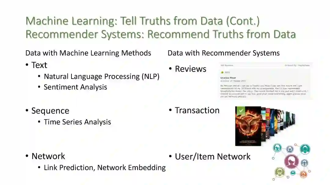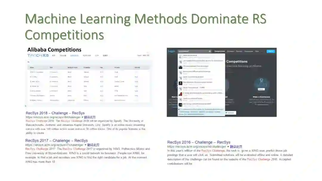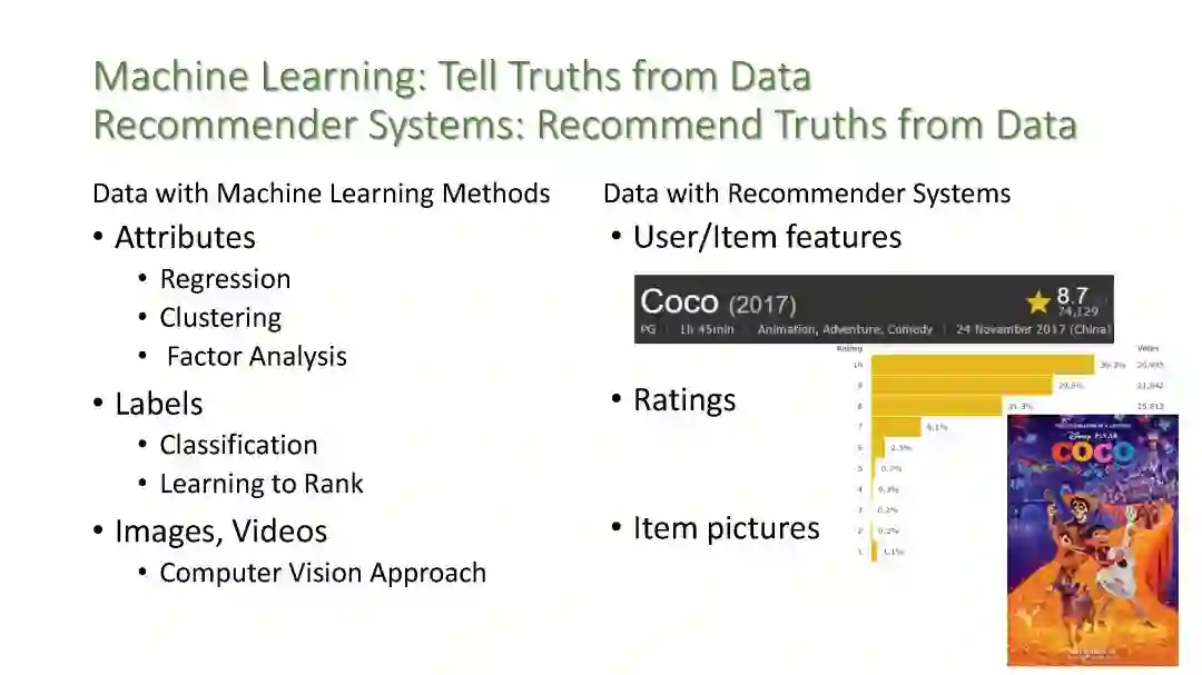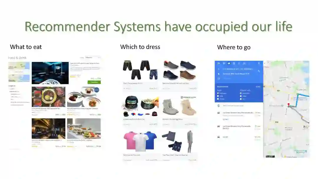 值得一提的是,推荐系统(RS),可能是最广泛使用的AI系统之一,它已经融入到我们日常生活的各个部分。 在AI时代,最前沿的机器学习方法,如深度学习,已经成为构建推荐系统的首选。 目前的机器学习方法是建立在数据的基础之上的,因此推荐任务可以看作这样一类问题:从数据中学习和推断。
