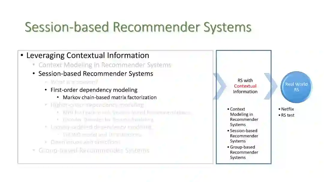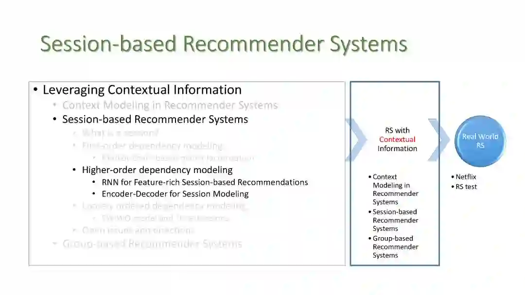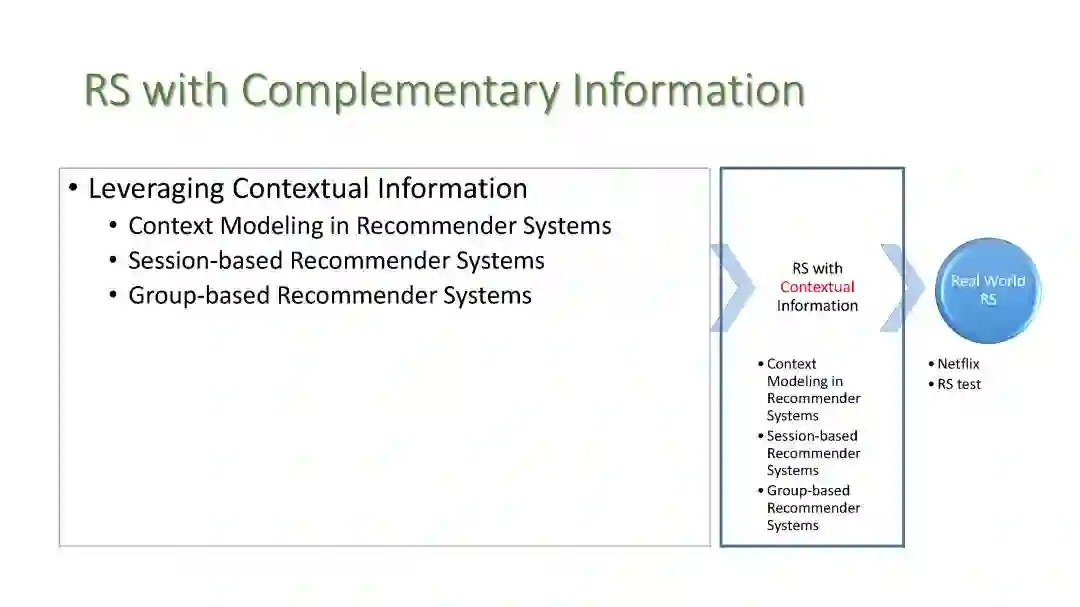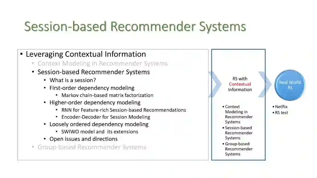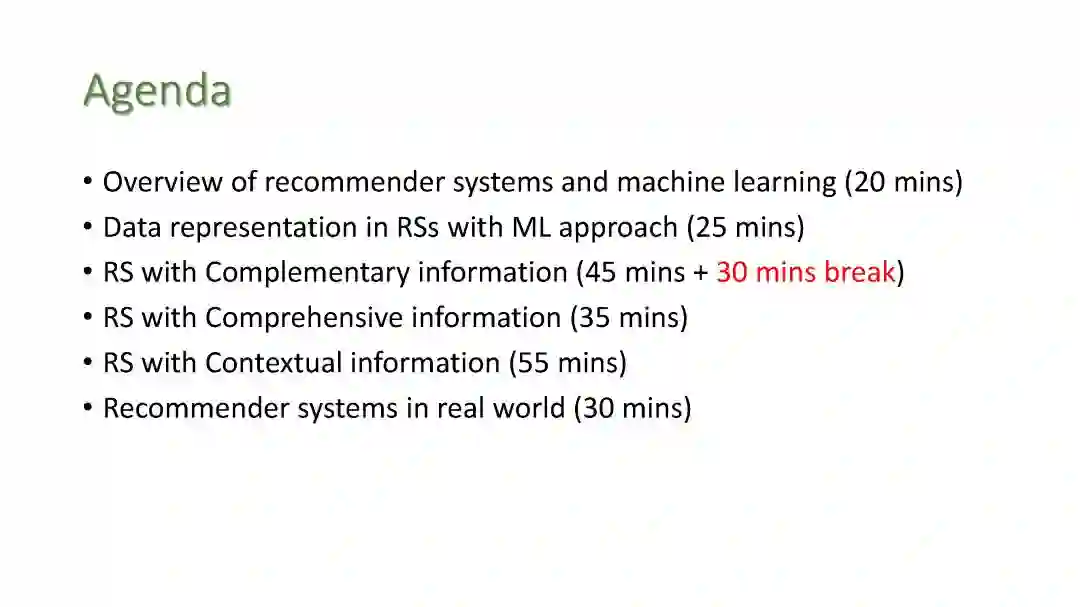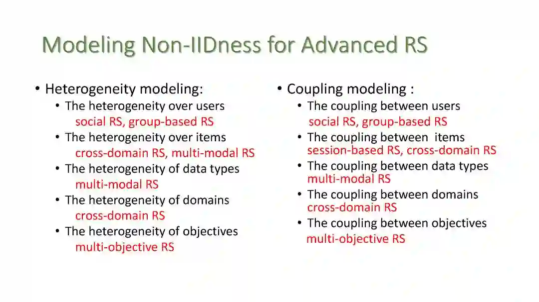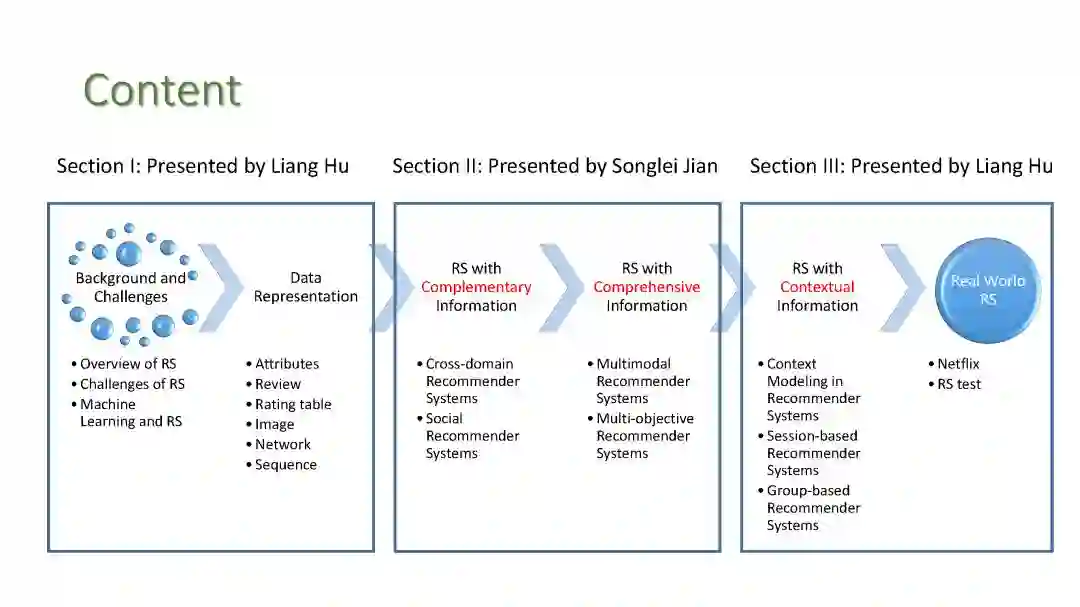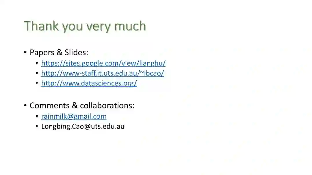 传统RS是基于相关数据,如评论,内容和/或社会关系,是独立同分布(IID)。 直观地说,这与现实生活中的数据特征不一致,不能代表相关数据的异质性和耦合关系。 因此,我们采用前沿机器学习的方法,通过耦合相关的异构数据来提高互补性,全面性和上下文(3C)信息的RS。 本教程将分析前沿推荐问题中的数据、挑战和业务需求,并采用非IID视角介绍机器学习方面的最新进展,建模基于上下文(3C)的下一代推荐系统(RS)。 包括RS发展综述和非IID推荐系统,跨域RS,社交RS,多模式RS,多标准RS,情境感知RS和基于分组的RS的高级机器学习,以及将它们组合构成真实的推荐系统。