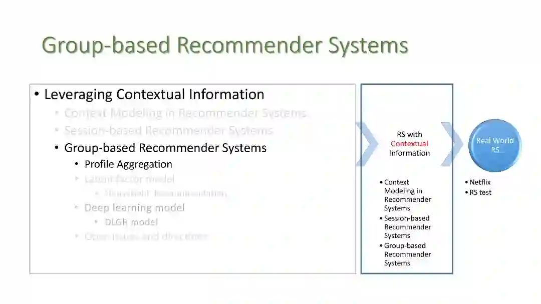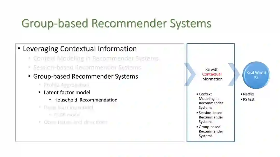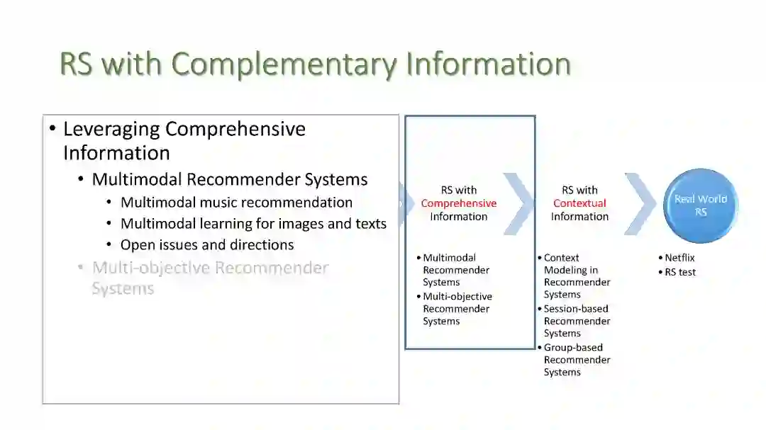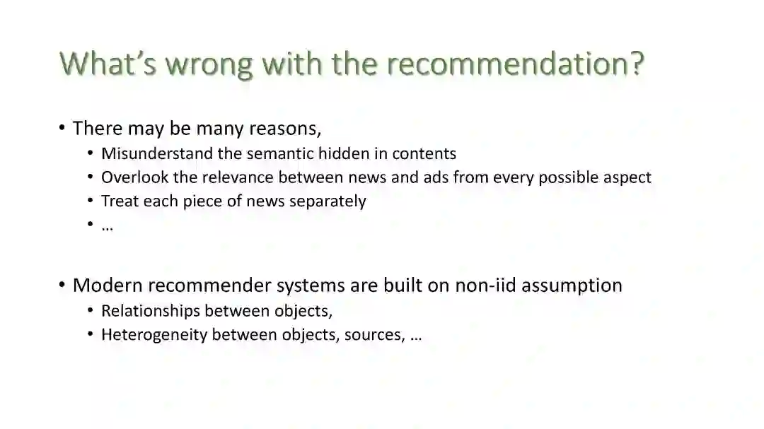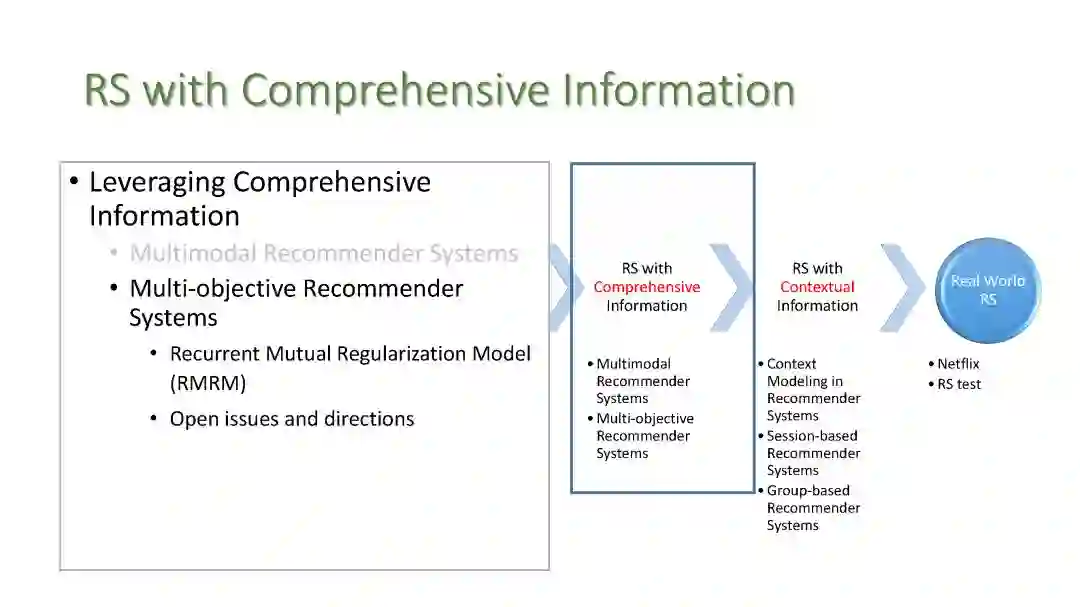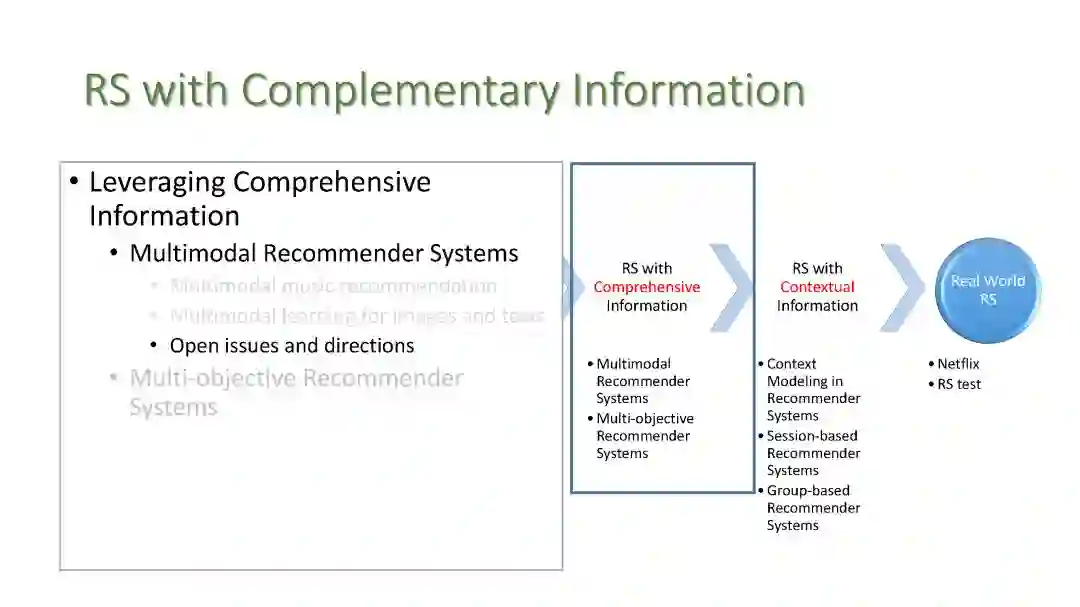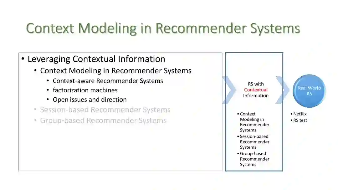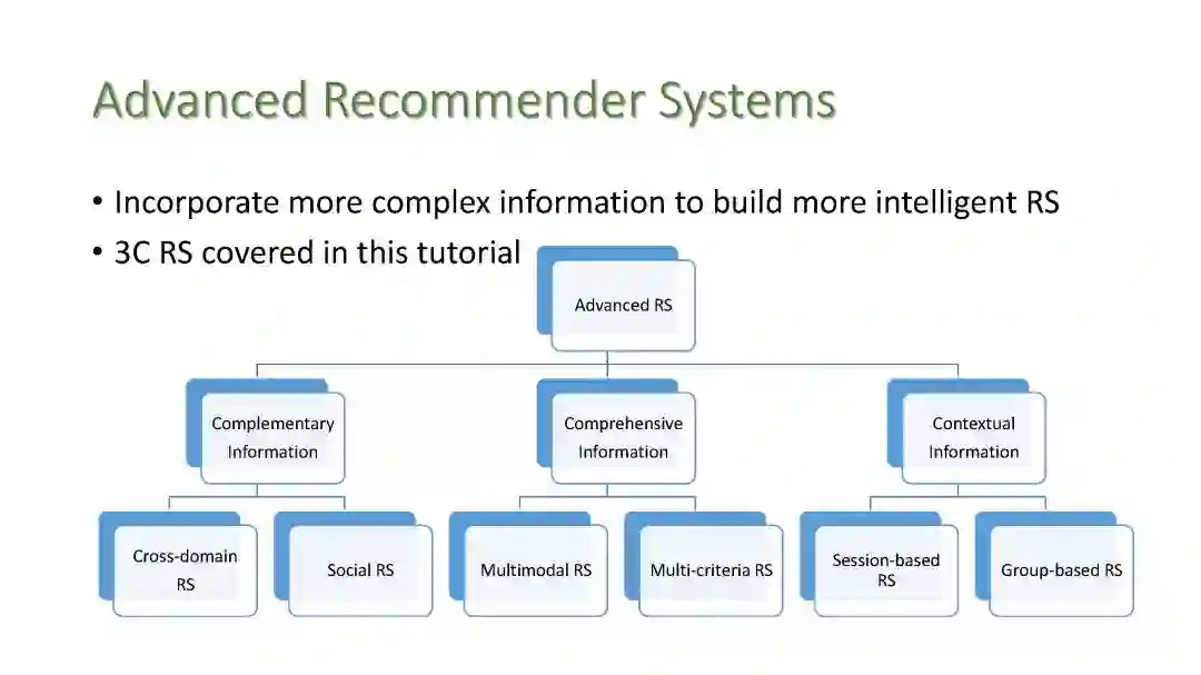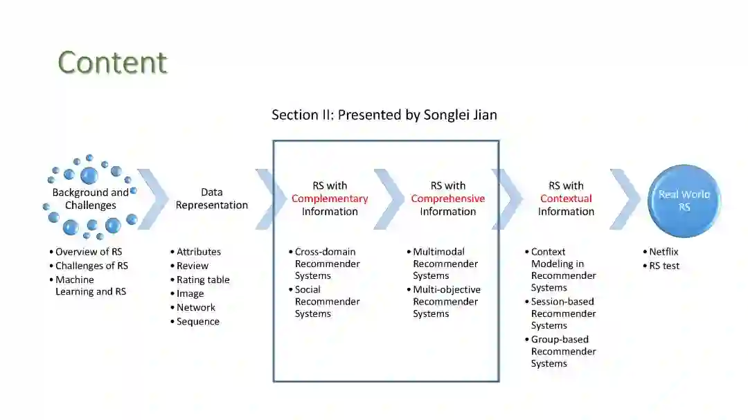 传统RS是基于相关数据,如评论,内容和/或社会关系,是独立同分布(IID)。 直观地说,这与现实生活中的数据特征不一致,不能代表相关数据的异质性和耦合关系。 因此,我们采用前沿机器学习的方法,通过耦合相关的异构数据来提高互补性,全面性和上下文(3C)信息的RS。 本教程将分析前沿推荐问题中的数据、挑战和业务需求,并采用非IID视角介绍机器学习方面的最新进展,建模基于上下文(3C)的下一代推荐系统(RS)。 包括RS发展综述和非IID推荐系统,跨域RS,社交RS,多模式RS,多标准RS,情境感知RS和基于分组的RS的高级机器学习,以及将它们组合构成真实的推荐系统。