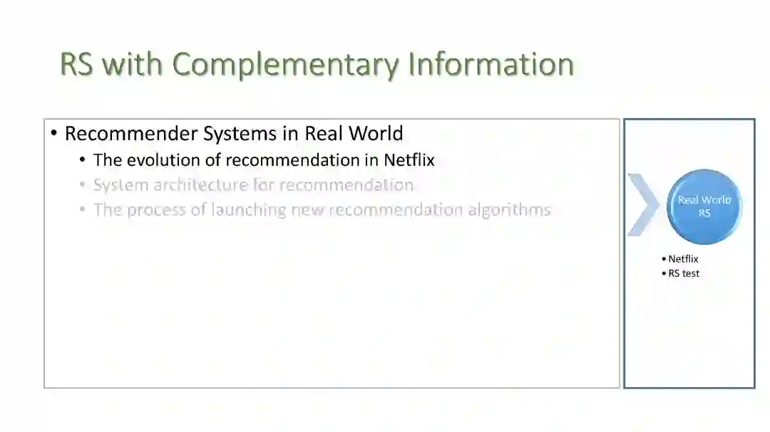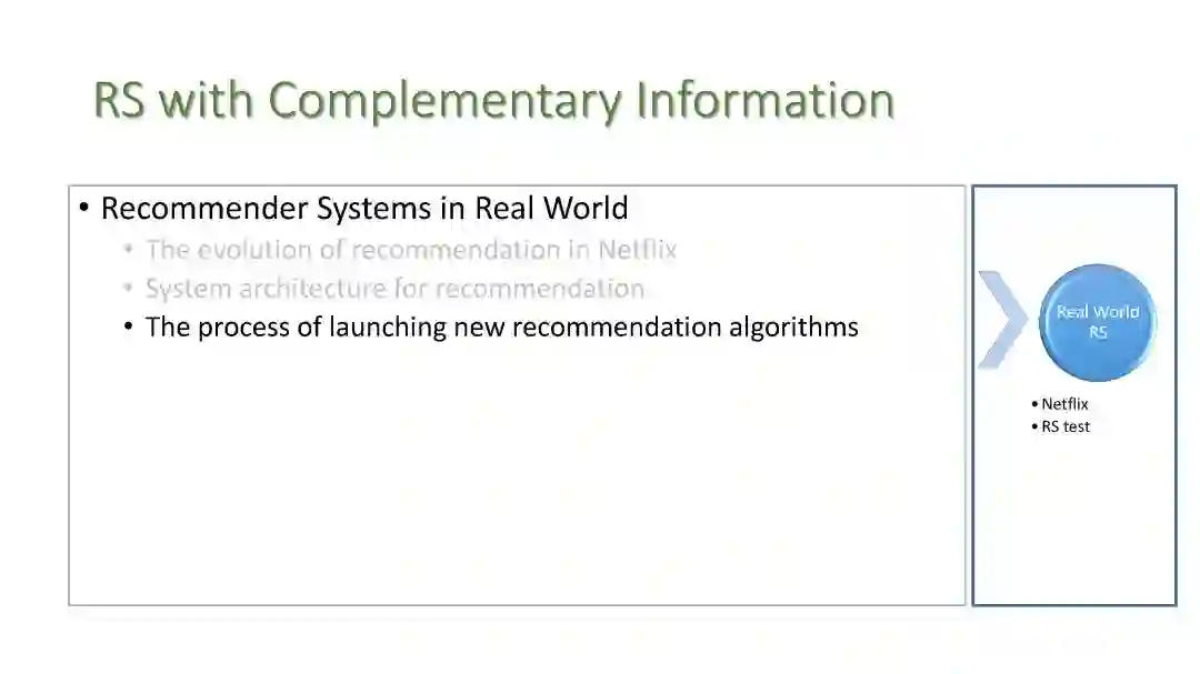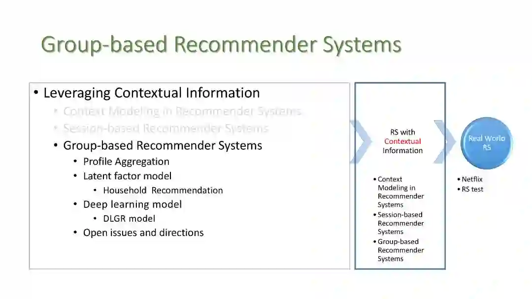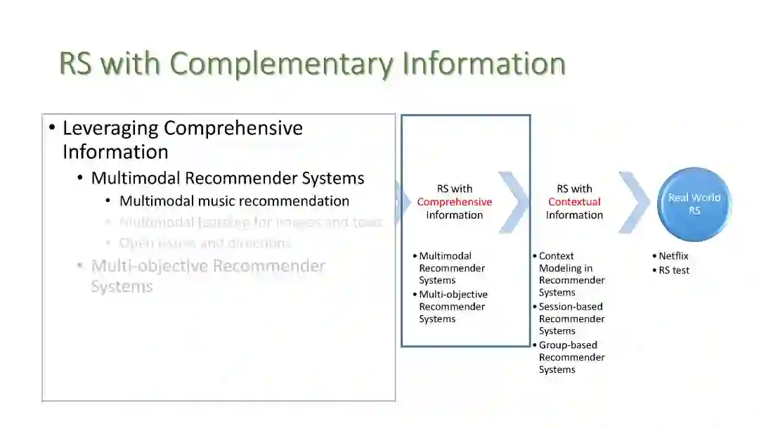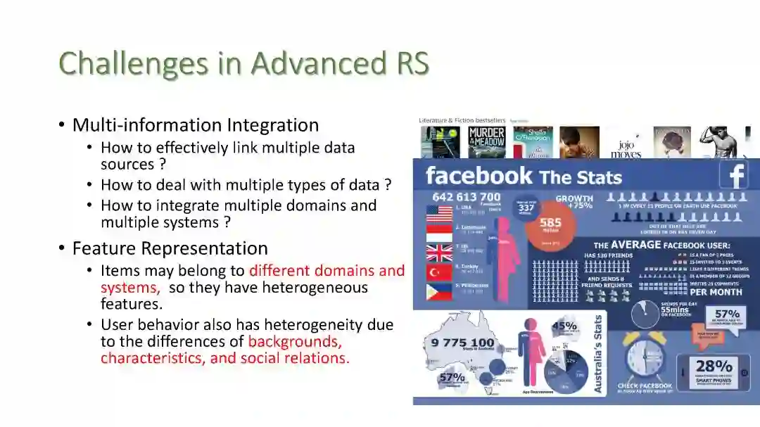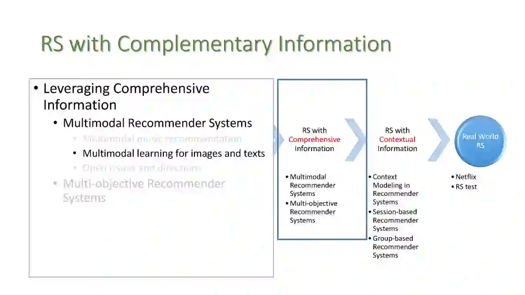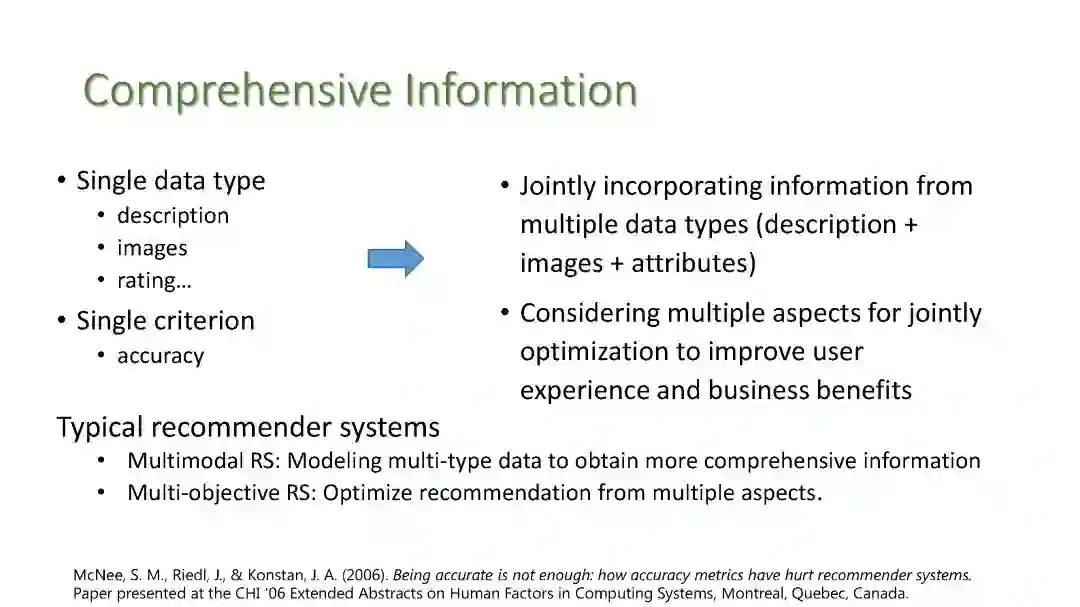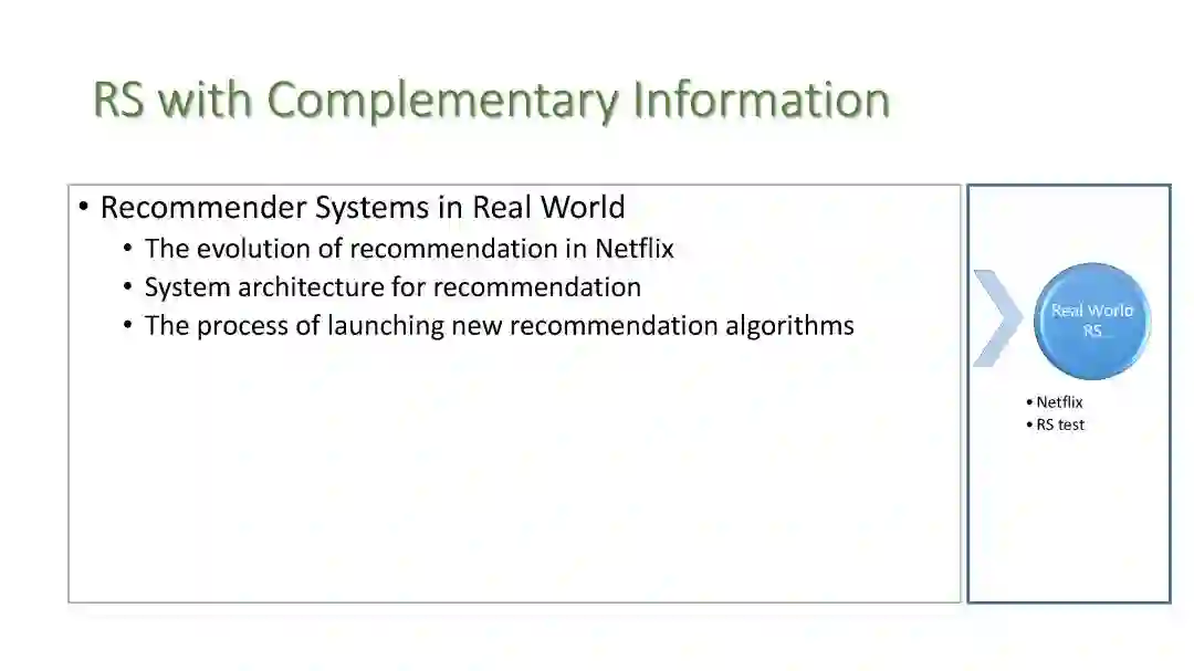 传统RS是基于相关数据,如评论,内容和/或社会关系,是独立同分布(IID)。 直观地说,这与现实生活中的数据特征不一致,不能代表相关数据的异质性和耦合关系。 因此,我们采用前沿机器学习的方法,通过耦合相关的异构数据来提高互补性,全面性和上下文(3C)信息的RS。 本教程将分析前沿推荐问题中的数据、挑战和业务需求,并采用非IID视角介绍机器学习方面的最新进展,建模基于上下文(3C)的下一代推荐系统(RS)。 包括RS发展综述和非IID推荐系统,跨域RS,社交RS,多模式RS,多标准RS,情境感知RS和基于分组的RS的高级机器学习,以及将它们组合构成真实的推荐系统。
