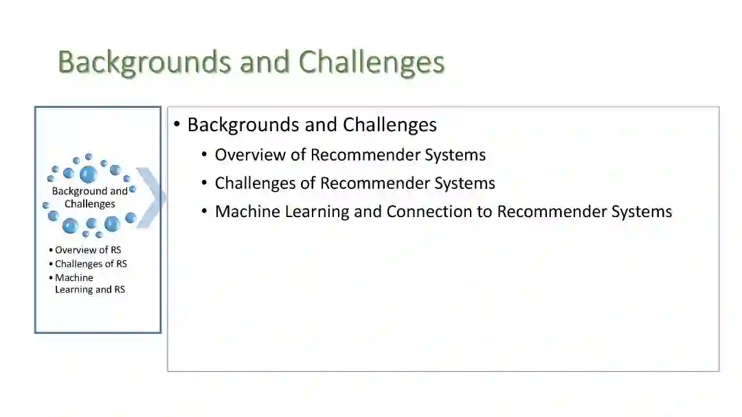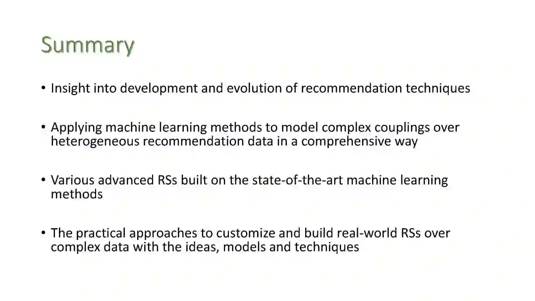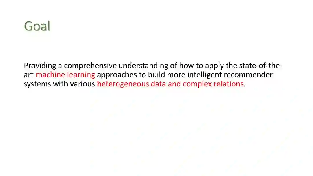本教程的目标是让学术界和实践人员能够全面了解如何应用最前沿的机器学习方法,以便在各种异构数据和复杂场景中构建新一代推荐系统。 在本教程中,我们将介绍最前沿的机器学习技术及其应用,以构建智能推荐系统。 在本教程之后,读者可以掌握: