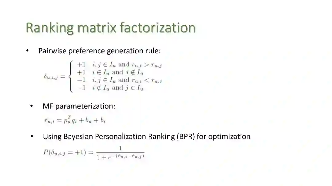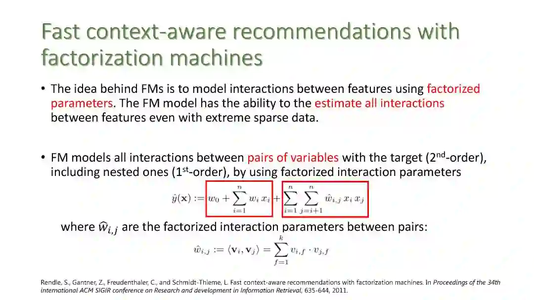 Rendle, S., Gantner, Z., Freudenthaler, C., & Schmidt-Thieme, L. (2011, July). Fast context-aware recommendations with factorization machines. In Proceedings of the 34th international ACM SIGIR conference on Research and development in Information Retrieval (pp. 635-644). ACM.