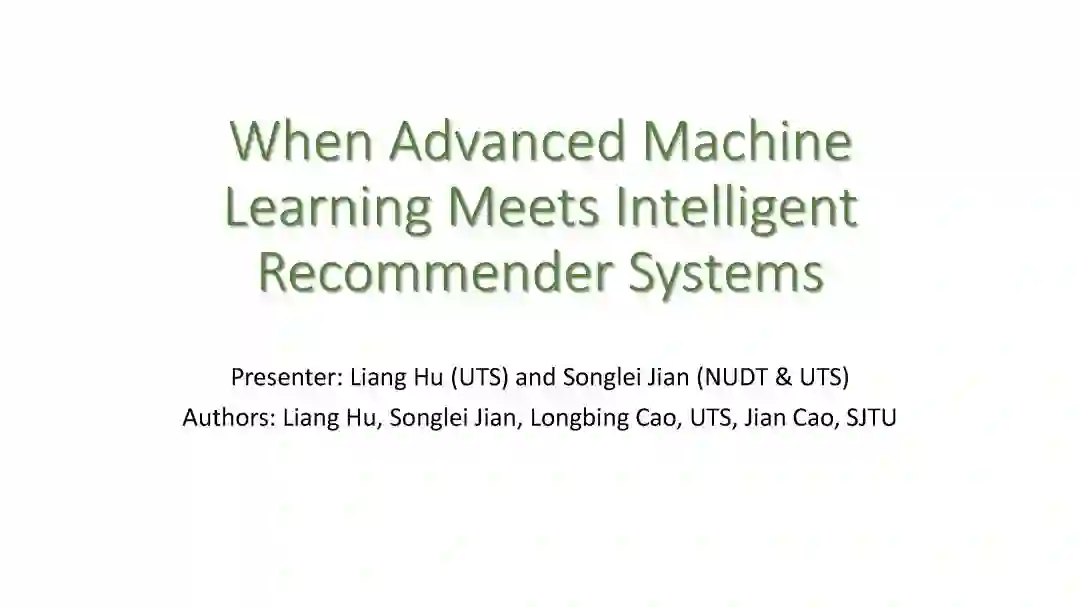 【导读】第32届AAAI大会-AAAI 2018将于2月2号-7号在美国新奥尔良召开,悉尼科技大学Liang Hu博士即将在大会作报告“When Advanced Machine Learning Meets Intelligent Recommender Systems” ,主要教读者如何用最前沿的机器学习算法实现智能推荐系统。主要内容包括但不局限于:推荐系统的发展进程、如何用机器学习方法建模异构数据、在推荐系统中使用前沿的机器学习算法、构建先进的推荐系统等。文章对推荐算法的总结较为全面,并介绍最新的技术方法,如果您对推荐系统感兴趣,我们建议您关注大会的日常以及Liang Hu博士精彩的分享。专知内容组整理出他放出的PPT内容,欢迎大家查看。