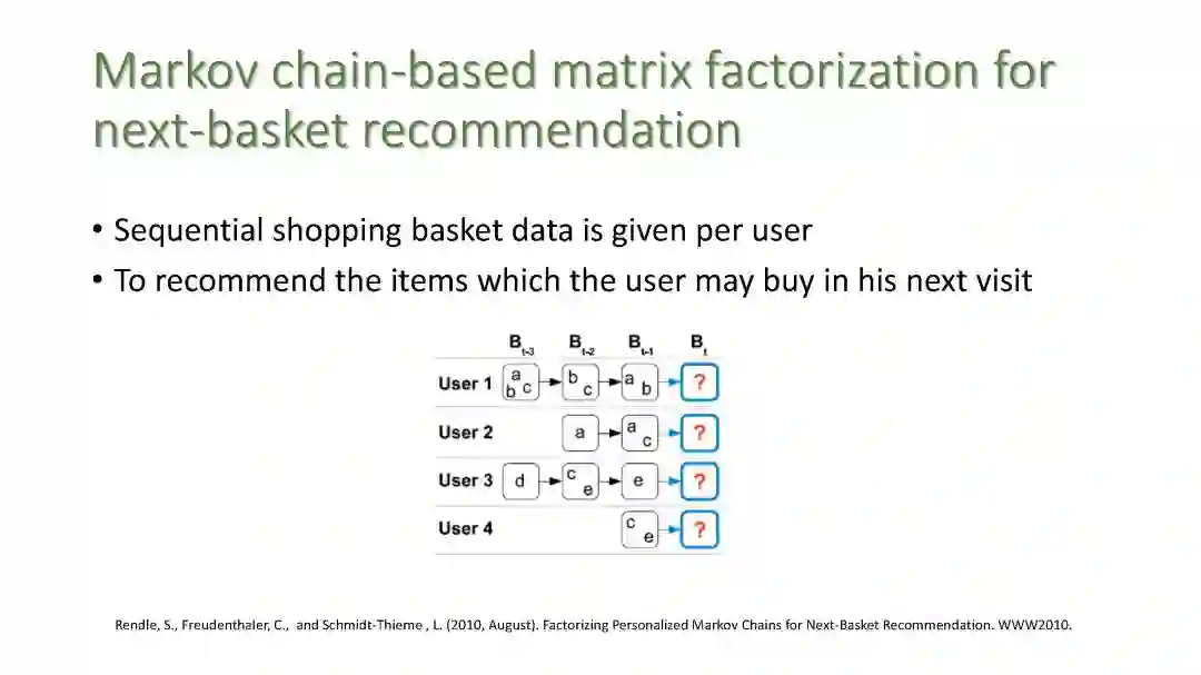 Rendle, S., Freudenthaler, C., and Schmidt-Thieme , L. (2010, August). Factorizing Personalized Markov Chains for Next-Basket Recommendation. WWW2010.