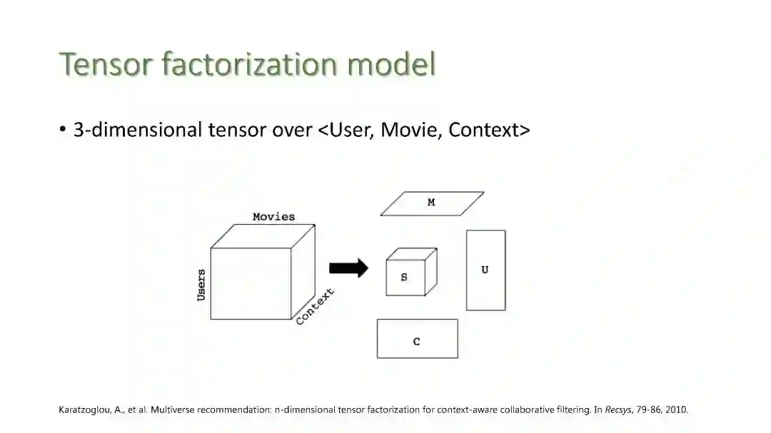 Karatzoglou, A., Amatriain, X., Baltrunas, L., & Oliver, N. (2010, September). Multiverse recommendation: n-dimensional tensor factorization for context-aware collaborative filtering. In Proceedings of the fourth ACM conference on Recommender systems (pp. 79-86). ACM.