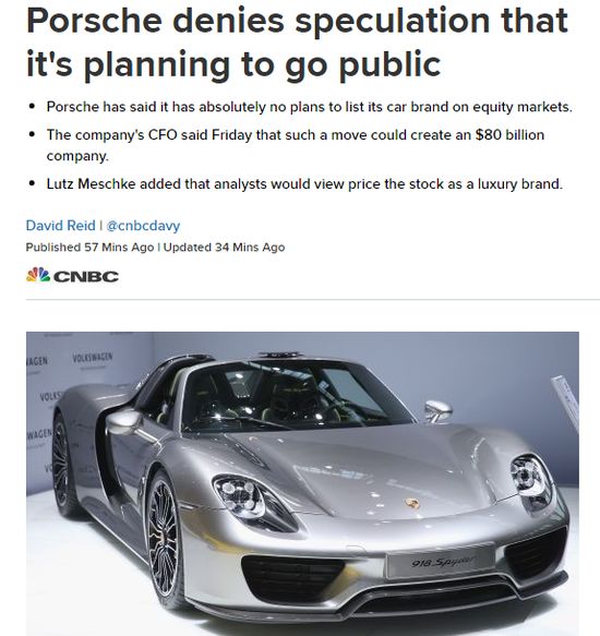 在周一一份电子邮件回复中,保时捷断然否认其正在计划IPO的传言。邮件表示,“保时捷目前没有任何计划进行(部分)IPO计划。否认任何相关的报道。”保时捷还表示,Meschke的言论只是反映了法拉利的上市是“一个积极的案例,说明在当前汽车行业转型时期,IPO是一项比较好的选择。”保时捷进一步强调,Meschke曾表示,他无权参与保时捷的任何IPO计划,最终决定权掌握在母公司大众汽车的高管手中。
