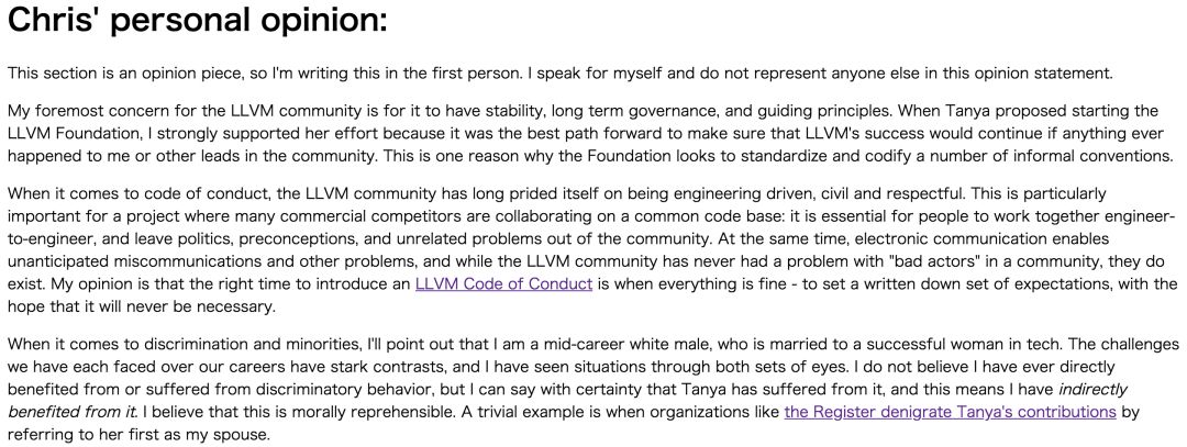 之后,Chris 认为之前发的推文措辞不佳,再次发布一篇长文以表明自己的观点。在文中,他详细说明了该事件直接涉及到的几个人以及 LLVM 基金会、Outreachy 组织中间的关系:与 Outreachy 和 Google Summer of Code 等组织的合作是 LLVM 基金会的发展计划之一,旨在提高技术的参与度。