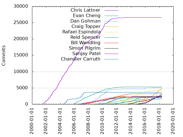 Rafael 自 2006 年以来已为 LLVM 贡献了超过 4,300 个 commits ,添加了 157,679 行代码,是 LLVM 的排名第五的贡献者。