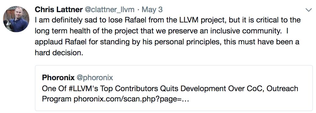Swift 语言之父 Chris Lattner ,同时还有另外一个身份是 LLVM 项目的主要发起人和作者之一,在事件发生后通过 Twitter 进行了评论。Chris 对 Rafael 的离开表示遗憾,并对其坚持个人原则的行为表示赞扬,但同时强调让项目更健康的长期发展需要的是一个包容的 LLVM 社区。