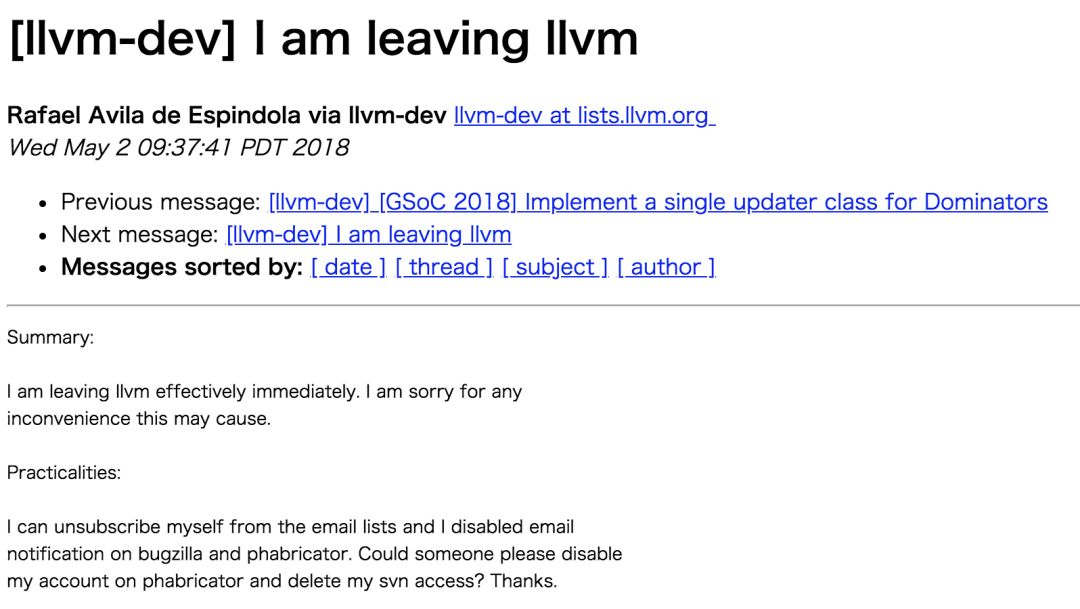 在邮件中,Rafael 回顾了他参与编译器开发的完整经历,从最初的 GCC,到之后转向并专注于 LLVM ,期间经历了许多事情。对于离开的原因,也做了详细解释: