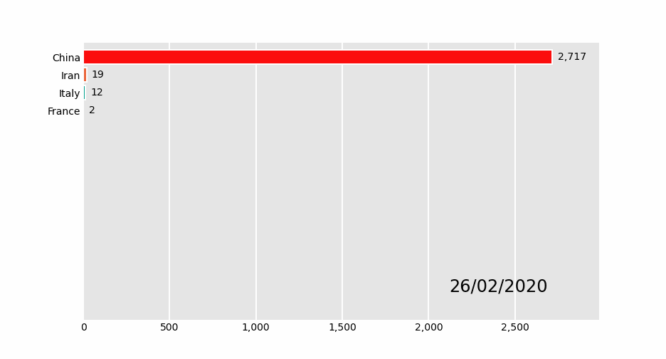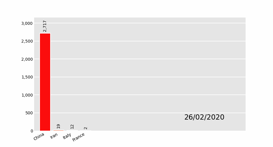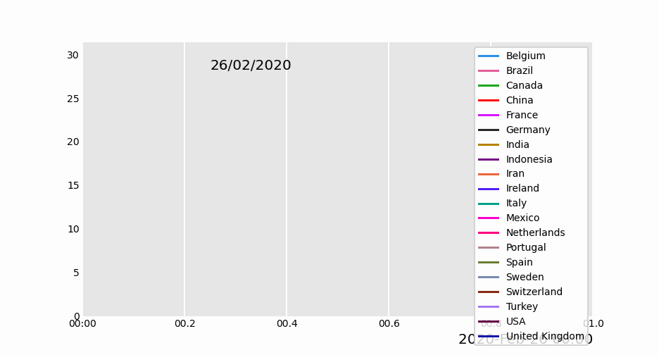 import pandas_aliveimport pandas as pdcovid_df = pd.read_csv('data/covid19.csv', index_col=0, parse_dates=[0])covid_df.plot_animated(filename='examples/example-barh-chart.gif', n_visible=15)