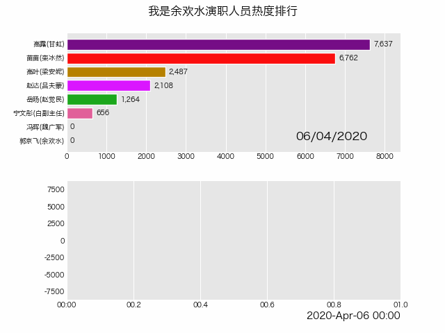 # 中文显示plt.rcParams['font.sans-serif'] = ['SimHei'] # Windowsplt.rcParams['font.sans-serif'] = ['Hiragino Sans GB'] # Macplt.rcParams['axes.unicode_minus'] = False# 读取数据df_result = pd.read_csv('data/yuhuanshui.csv', index_col=0, parse_dates=[0])# 生成图表animated_line_chart = df_result.diff().fillna(0).plot_animated(kind='line', period_label=False, add_legend=False)animated_bar_chart = df_result.plot_animated(n_visible=10)pandas_alive.animate_multiple_plots('examples/yuhuanshui.gif',[animated_bar_chart, animated_line_chart], enable_progress_bar=True,title='我是余欢水演职人员热度排行')