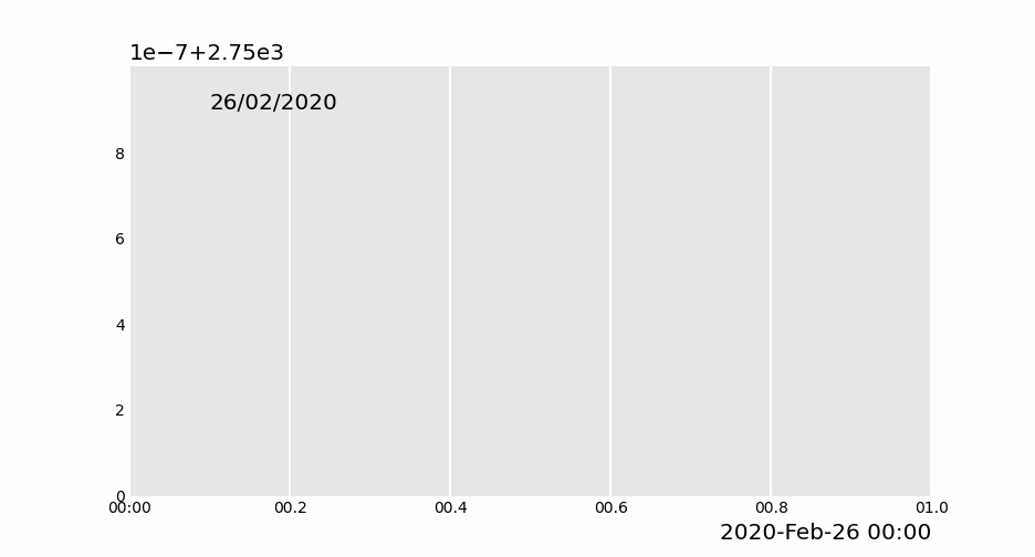 covid_df = pd.read_csv('data/covid19.csv', index_col=0, parse_dates=[0])covid_df.sum(axis=1).fillna(0).plot_animated(filename='examples/example-bar-chart.gif', kind='bar', period_label={'x': 0.1, 'y': 0.9}, enable_progress_bar=True, steps_per_period=2, interpolate_period=True, period_length=200)