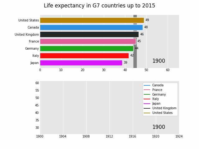 pandas_alive.animate_multiple_plots( "examples/life-expectancy.gif", plots=[animated_bar_chart, animated_line_chart], title="Life expectancy in G7 countries up to 2015", adjust_subplot_left=0.2, adjust_subplot_top=0.9, enable_progress_bar=True )