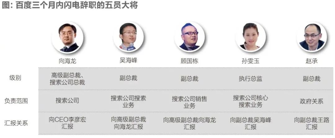 位高管:高级副总裁向海龙、百度副总裁吴海锋、顾国栋、赵承,以及执行总监孙雯玉相继