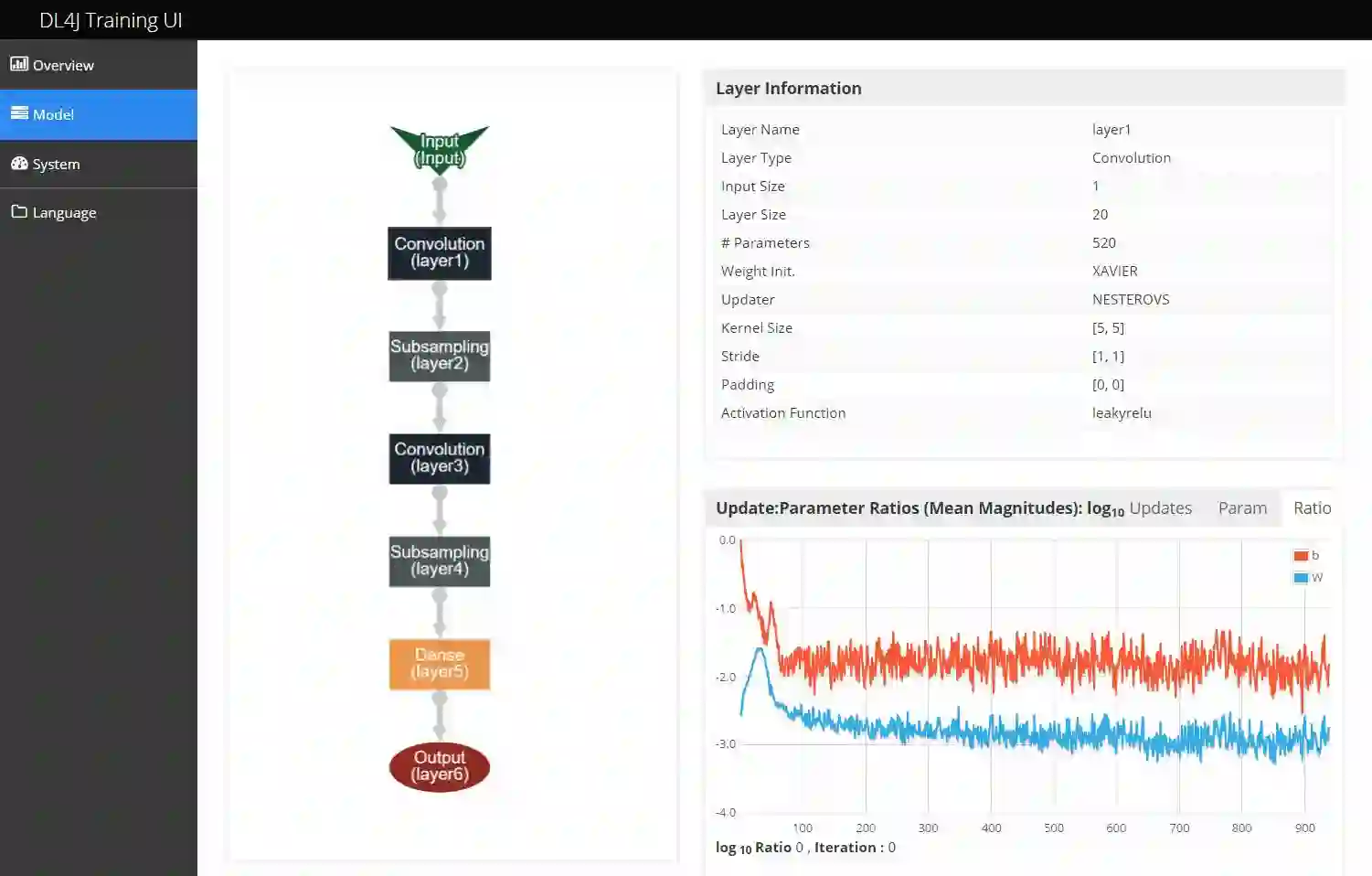 Deeplearning4j UI: 可视化组件,类似Tensorflow的TensorBoard。可以用于可视化网络结构,以及网络训练中变量的监控。