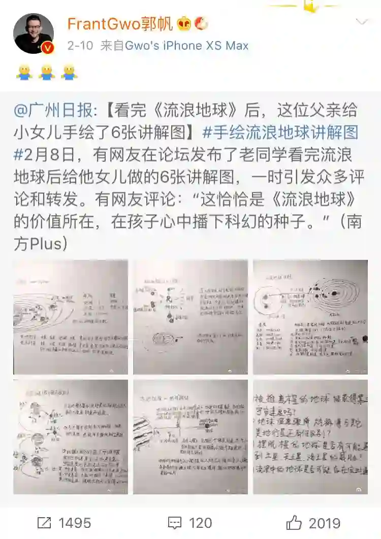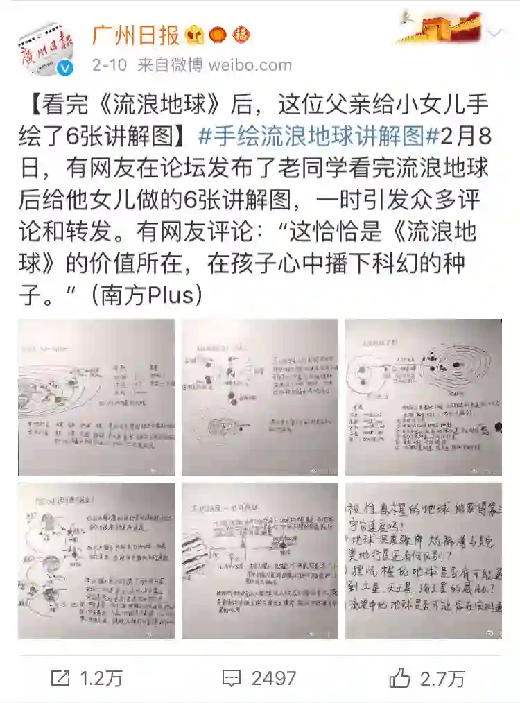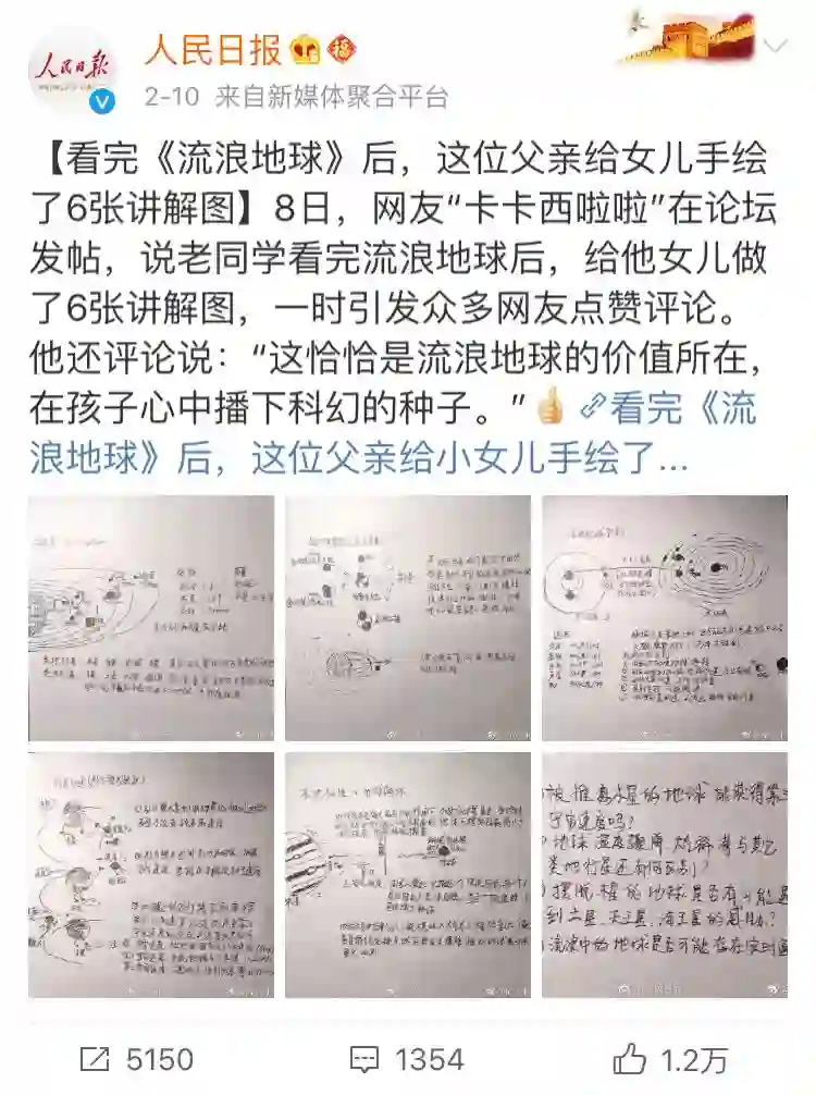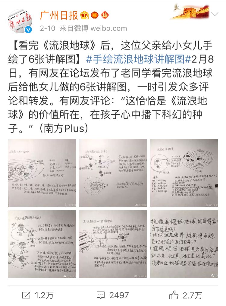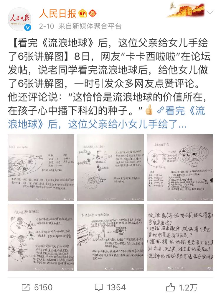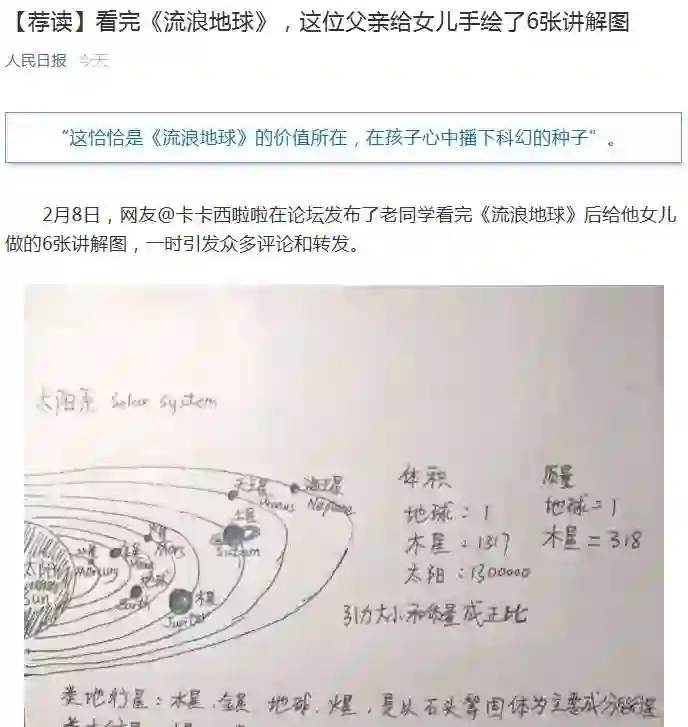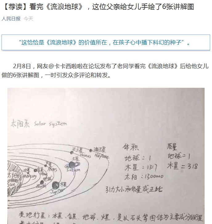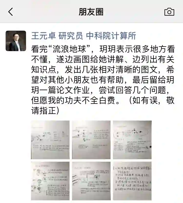 2月7日,中科院计算所王元卓研究员带女儿看完《流浪地球》,女儿表示很多地方看不懂,学霸父亲怎么能忍,遂边画图边给女儿讲解相关科学知识,还给女儿留了个论文作业。最后还把讲解图分享在朋友圈,希望可以帮助其他的小朋友。