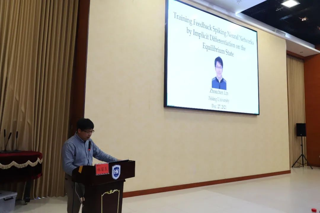 随后,来自北京大学的林宙辰教授进行了主题为“Training Feedback Spiking Neural Networks by Implicit Differentiation on the Equilibrium State ”的报告,报告指出SNN模型在神经形态硬件上具有高效节能性,与现有ANN网络相比有着显著优势。介绍完SNN模型的具体网络架构,林教授提出下一代人工神经网络模型,并总结了网络理论上的方程推导以及网络在参数量等方面的提升。