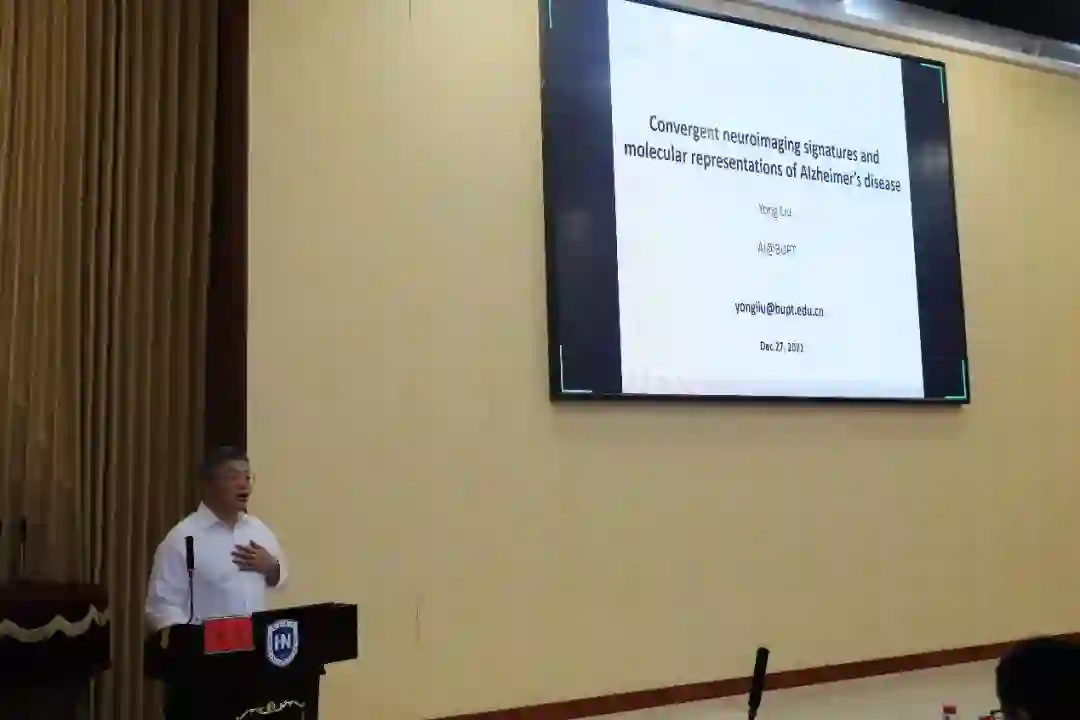 最后,北京邮电大学刘勇教授做了题目为“Convergent Neuroimaging Signatures and Molecular Representations of Alzheimer’s Disease”的报告,报告主要围绕智能脑影像研究展开,介绍了目前用于识别阿尔茨海默症的方法,如生物标记物和影像组学等。主要介绍了团队近年来在大样本多中心上的工作,比如自己团队就正在研究如何通过了解阿尔兹海默症的已知风险基因对大脑结构的影响来识别阿尔茨海默症。