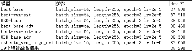 指称项分类模型训练中使用二次训练的方法 F1 提升了约 1%,使用对抗学习 F1 提升了约 0.5%,模型融合后在 Dev 数据上 F1 值达到了 90.02%。具体参数和验证数据集下结果如下表: