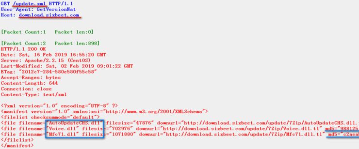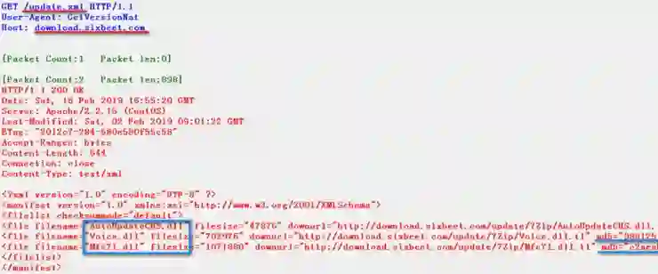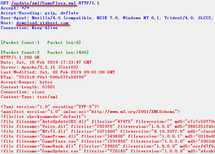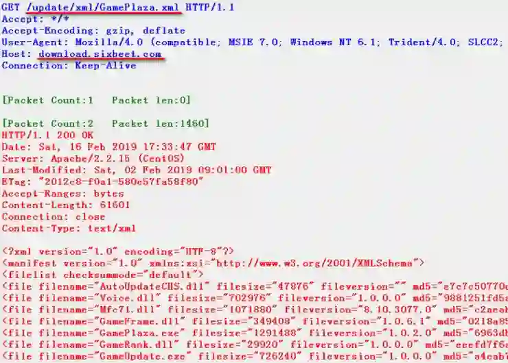 恶意模块“libcef.dll”启动后,联网下载“update.xml”配置列表,其中包含三个工作模块的文件名和hash值,用于替换“集结号”安装目录下的程序模块,保证启动的游戏能够加载恶意代码。