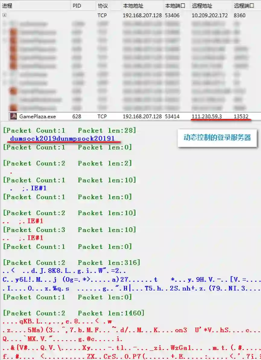 游戏刚启动时,恶意模块往C&C服务器“111.230.126.189:5712”发送加密上线包,服务端则返回一条加密控制信息,其中包含“集结号”的登录服务器地址信息,这些登录服务器是对应显示在游戏登录窗口的服务器列表,实则由木马作者动态控制,也就是说用户登录步骤完全被木马程序劫持了。