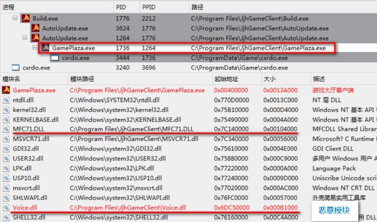 另外两个工作模块“Voice.dll”和“Mfc71.dll”也算是一例“白加黑”的利用,棋牌游戏的主程序“GamePlaza.exe”在启动过程中会自动导入“Mfc71.dll”这个运行库,但该库又引入了“Voice.dll”模块,最终恶意模块“Voice.dll”将在游戏启动时自动加载来进行盗号的任务。