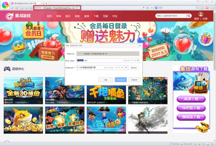 直接点击打开第一条网址,进入该网站,看到页面做的很逼真,高仿正规棋牌游戏网站,实际上点击任意按钮却会弹出同一个下载地址如下所示,下载的文件即是包含盗号木马的“集结号”游戏安装包。