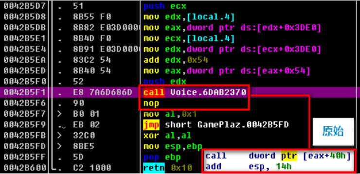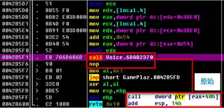 恶意模块“Voice.dll”为此盗号木马最核心的功能模块,其中包含大量的代码混淆处理来对抗分析。调试过程中发现,该模块对“集结号”游戏启动过程中加载的多个程序模块做了hook操作,如“GamePlaza.exe”、“ChannelModule.dll”等,但实际盗号过程中并没有执行到,猜测是以前使用的盗号方式没有去掉。