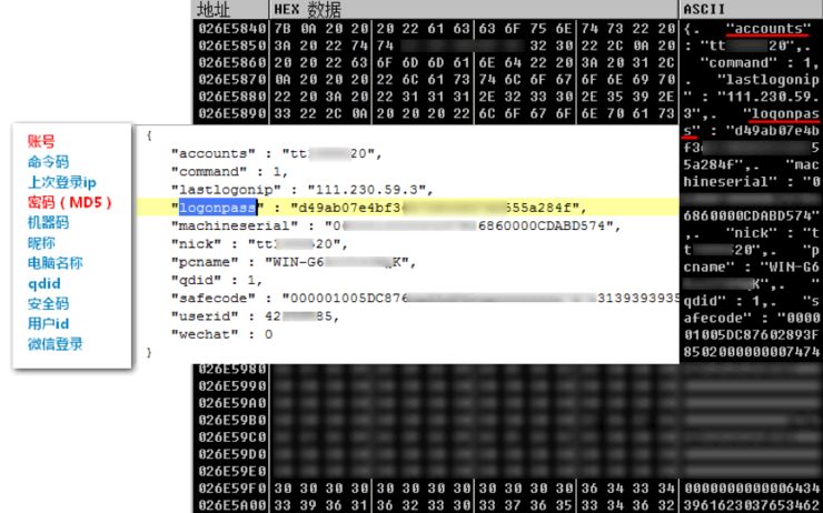 用户成功登录后,木马就将盗取的账户密码等登录信息以json数据格式组织并加密回传到C&C服务器,回传的信息字段如下: