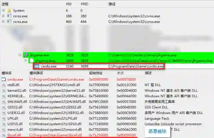 在真实的环境中进行安装测试,安装完成后将自动运行“cxrdo.exe”程序来启动恶意模块“libcef.dll”,此过程是一例“白加黑”的利用。
