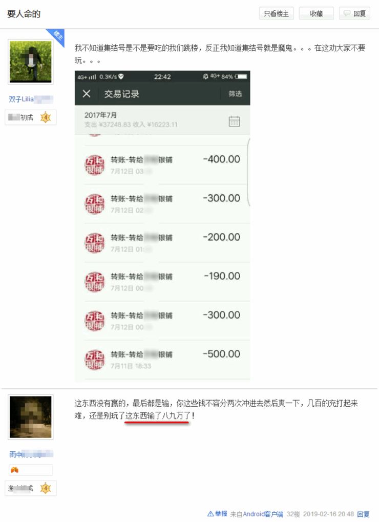 再次忽略这条广告,查看贴吧里的内容可以了解到一些“集结号”相关的行情。首先关注到这类棋牌游戏还是有不少用户在玩,并且似乎很容易上瘾,甚至很多用户都是往里面充了不少钱,以下帖子为某用户的吐槽: