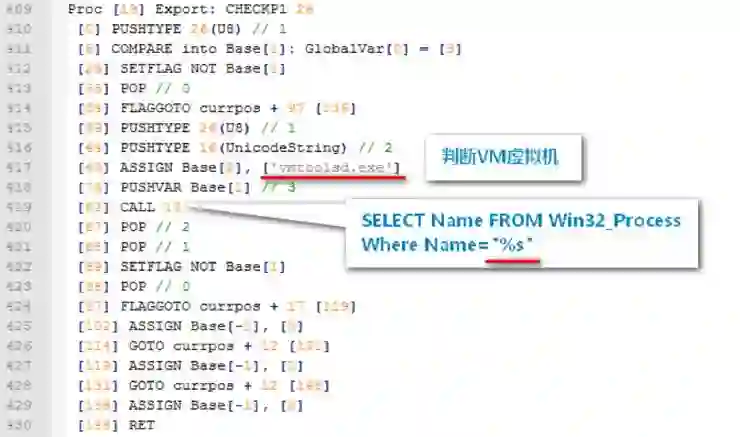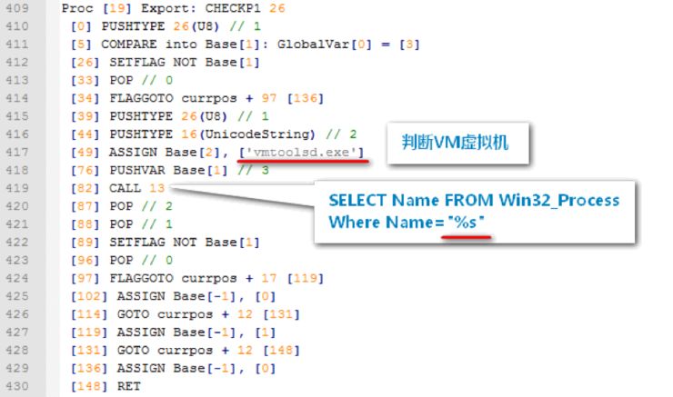 “checkP1”函数的判断比较简单,通过执行一个WBEMScripting脚本查询进程列表中是否有“vmtoolsd.exe”来检测虚拟机,若该安装包是在vm虚拟机中运行的则不会释放恶意模块。