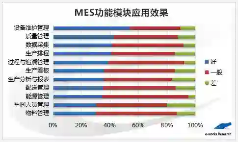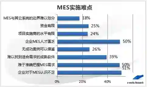 e-works认为,目前中国制造企业的MES软件应用仍处于“功能普及、能力提升”的阶段。各行业MES各功能模块的应用效果有所不同,MES数据采集方式方法仍然比较单一,MES应用成功率不高,企业对MES系统认识不足、需求难以准确把握、企业MES人才匮乏是MES系统实施过程中的突出难点。
