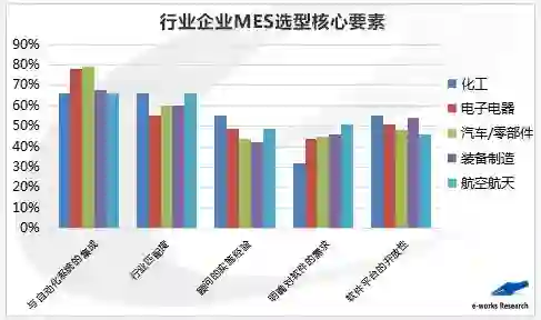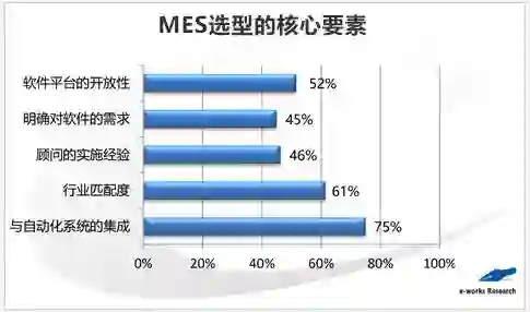 在众多选型核心要素中,与自动化系统的集成、行业的匹配度以及软件平台的开放性是企业MES选型所考虑的三大核心要素,与2014年数据一致。离散和流程各行业均将与自动化系统的集成以及行业匹配度放在选型核心要素的前两位。