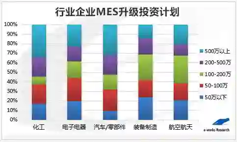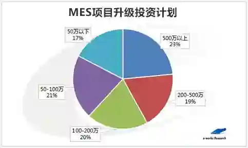 调查显示,在547家已实施MES企业中,有531家企业提出了MES下一步投资计划,占比高达 97%,MES升级需求大。在企业下一步投资计划中,42%的企业表示,未来MES的升级投资额将会超过200万。其中,23%的企业对MES的升级投资将超过500万。