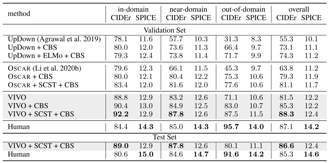 研究员们将 VIVO 与 nocaps 挑战中一些领先的方法,如 UpDown 、 OSCAR 等做了对比(这些方法使用的训练数据也是 COCO)。另外,遵循之前的方法,添加了使用 SCST 和 Constrained Beam Search (CBS)之后的结果。在 nocaps 的校验集(validation)和测试集(test)上的结果显示在表1中。可以看到,相比于之前的方法,VIVO 的结果表现有了显著的提高。仅仅使用 VIVO 预训练就取得了远超过 UpDown+ELMo+CBS 和 OSCAR 的结果。最终,VIVO 方法的结果达到了新的 SOTA,并且首次在 nocaps 挑战中超过了人类表现的 CIDEr 得分。