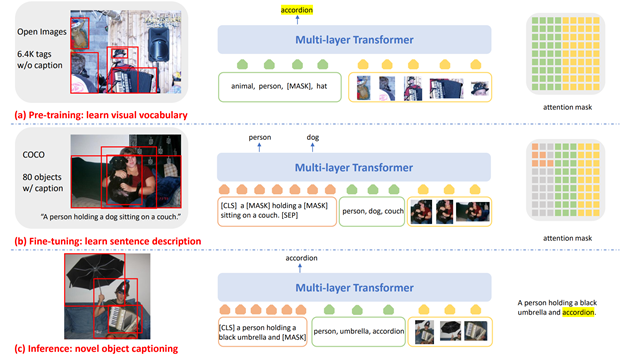 图2:训练和推理流程总览(a)在VIVO 预训练中,Transformer 模型在图片标签的训练数据上做标签预测,从而针对丰富的视觉概念进行多模态特征学习。(b)在微调中,模型在有文本描述标注的训练数据上学习如何基于图片和识别出来的物体生成一句话。(c)在推理时,对于给定的图片和识别的物体,模型以自回归的方式生成一系列字符,从而构成描述新物体的句子。