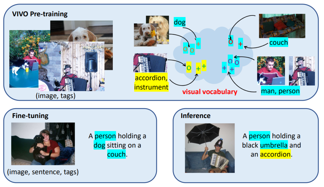 图1:VIVO 预训练使用大量的图片标签标注来建立视觉词表,其中语义相近的词汇与对应的图像区域特征会被映射到距离相近的向量上。微调使用只涵盖一部分物体(蓝色背景)的少量文本描述标注进行训练。在测试推理时,模型能够推广生成新物体(黄色背景)的语言描述,得益于预训练时见过的丰富物体类型。