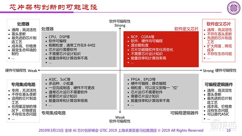 如果把已知的芯片都放到了二、三、四这三个象限后,一定很奇怪第一个象限中的是什么?第一个象限对应的芯片应该有很好的软件可编程性,同时有很好的硬件可编程性。如果这两者都成立的话,恰恰就是刚才所讲的“软件定义芯片”,不仅软件可编程,更重要的是硬件也可编程。