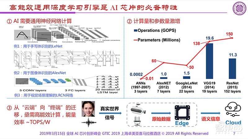 既然如此,我们就在考虑需要有一个所谓通用的深度学习引擎,如果把它往边缘上推的话就会发现这个引擎最重要的特点就必须是高能效。在高的计算能力和低的功耗两者驱动下,要获得好的芯片显然需要认真地思考用什么样的方式才能做。