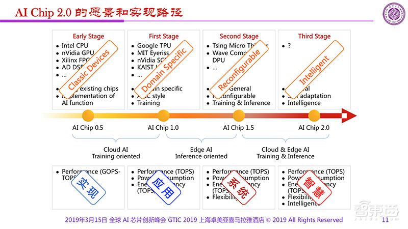 如果说我们在AI Chip 0.5的时候采用的是一些传统器件,到了AI Chip 1.0已经做到了领域专用,而AI Chip 1.5做到可重构、可配置,AI Chip 2.0就应该是智慧化。