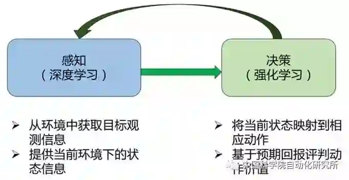 在通用人工智能领域,感知和决策能力都是衡量一个智能体所蕴含智能的关键指标。早期成功的强化学习应用案例主要依赖于组合人工特征和价值函数来实现,随着深度学习的进展,直接从原始的高维数据中提取特征变成可能。深度学习具有较强的感知能力,但是缺乏一定的决策能力;而强化学习具有决策能力,对感知问题束手无策。因此,将两者结合起来,优势互补,能够为复杂系统的感知决策问题提供解决思路。图2是深度强化学习的框架图,从图中可以看到,DRL的框架包含两个基本模块:由深度学习组成的感知模块和由强化学习组成的决策模块。两个模块之前通过状态动作相互影响。