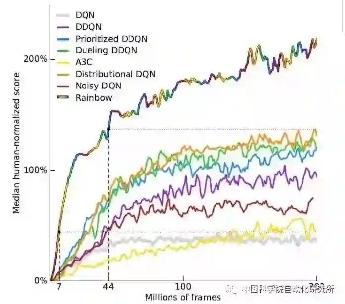 此后,研究人员在已有深度强化学习算法上做了进一步改进。Mnih等提出了深度强化学习的异步算法,通过CPU的多线程同时训练多个游戏,共享网络参数的同时也克服了训练数据的相关性,在多个CPU上训练极大提升了学习速率和算法性能。Jaderberg等提出UNREAL算法,在A3C的基础上学习多个辅助任务。UNREAL提升了深度强化学习的数据利用率,在Atari和三维游戏场景中都达到了更好的效果。作为DQN的一种变体,C51算法从分布式的角度分析深度强化学习,将Q(s,a)看做回报的近似分布而不是一个具体的近似期望值。与UNREAL算法相比,C51在Atari视频游戏上的平均性能表现要优于前者。参数噪声可以帮助算法更有效地探索周围的环境,加入参数噪声的训练方法将会让模型的效果大大提升,并且可以让我们更快地教会强化学习智能体执行任务。NoisyDQN在动作空间中借助噪声注入进行探索性行为,结果表明带有参数噪声的强化学习将比分别带有动作空间参数和进化策略的传统强化学习效率更高。以上的算法各自都可以提升深度强化学习性能的某个方面,因为它们都着力于解决不同的问题,而且都构建在同一个框架上,所以能够被整合起来。在DeepMind 最近发表的论文中,研究人员综合了主流深度强化学习方法,并提出了整合方案:Rainbow,如图5所示。通过实验结果,研究人员展示了整合后的表现,证明了这些算法很大程度上是互补的。最终,Rainbow在Atari2600 视频游戏基准测试平台的数据效率和最终结果上都达成了新的业界最佳水平。