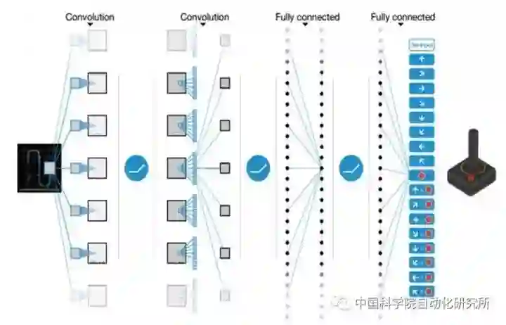 深度强化学习早期的主要思路是将神经网络用于复杂高维数据的特征提取,转化到低维特征空间便于强化学习处理。由于卷积神经网络对图像处理拥有天然的优势,将卷积神经网络与强化学习结合成了研究热点。2013年,DeepMind团队发表了一篇关于深度强化学习应用于Atari视频游戏的重量级论文,首次在复杂高维的状态空间下使用深度强化学习学会了游戏策略。该文章中提出的深度强化学习框架被称为深度Q网络(DeepQ Network:DQN)。2015年,DeepMind团队进一步完善了DQN算法,并将研究成果发表在Nature上。DQN将深度卷积神经网络和Q学习结合到一起,并集成了经验回放技术和目标Q网络。经验回放通过周期采样历史数据增加了数据的利用效率,同时减少了数据之间的相关性。DQN在大部分Atari视频游戏中实现了人类玩家的控制效果,是深度强化学习领域重要的开创性工作。